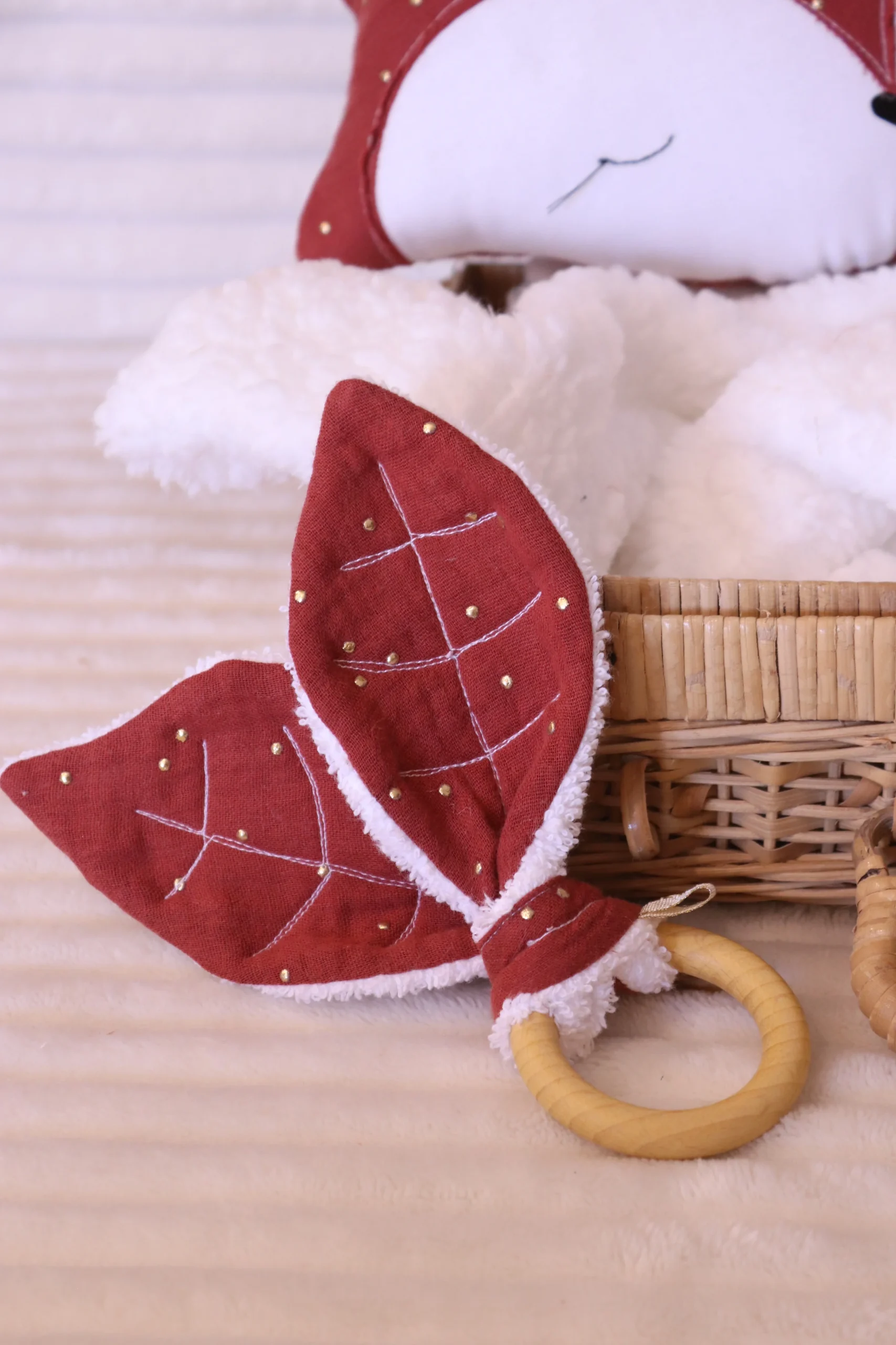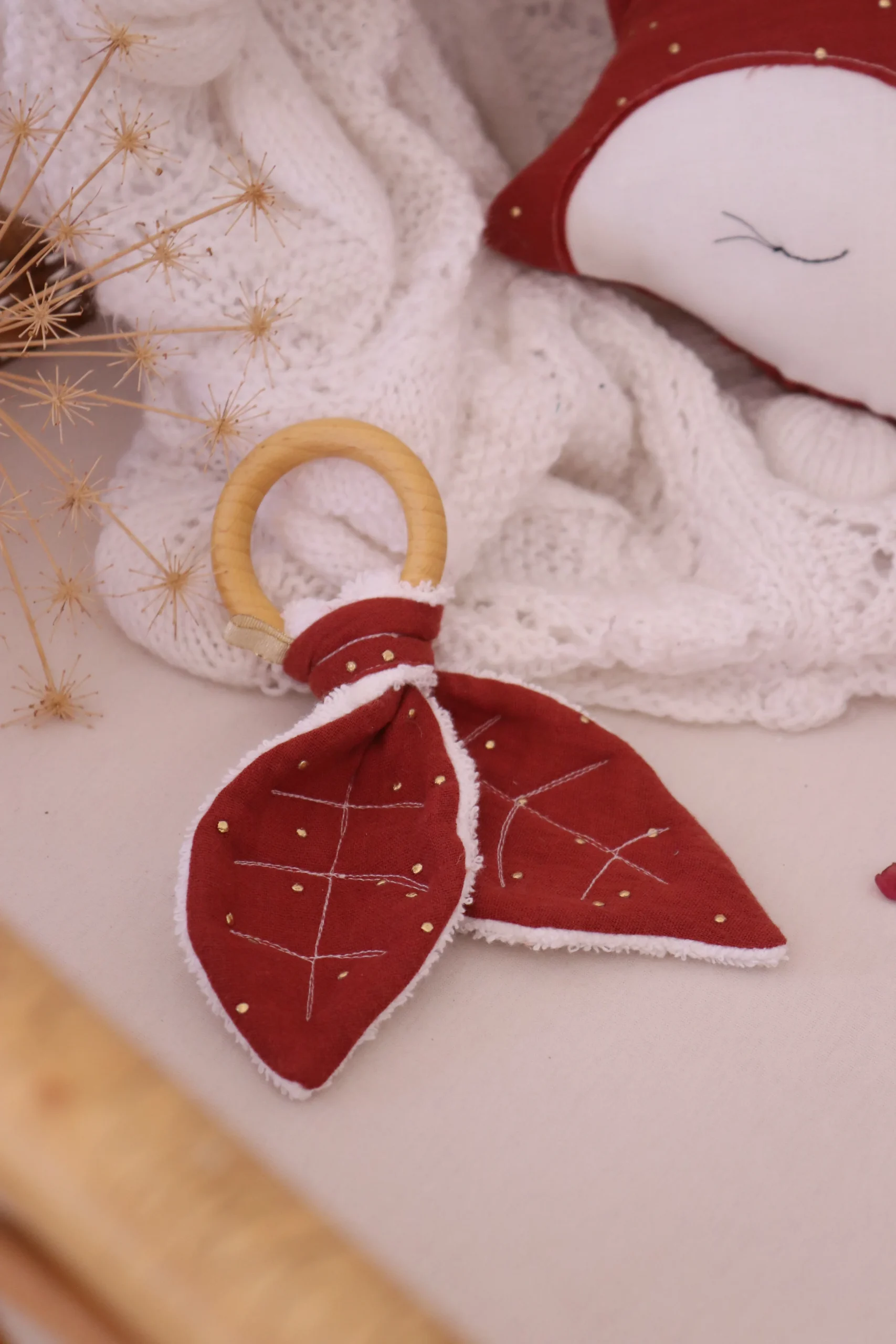 Anneau de dentition en bois non traité et coton certifié bébé . Il soulage les dents des bébés qui adore mâchouiller les petites oreilles en attrapant facilement l’anneau de ses petites mains !