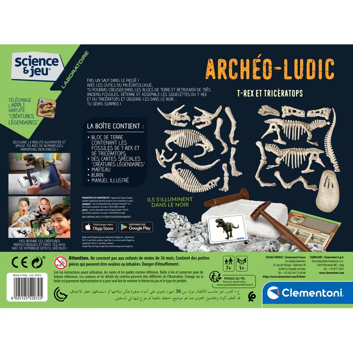 Avec ce coffret scientifique tu pourras recréer la lutte féroce entre le prédateur et sa proie. Creuse dans les blocs de terre et récupère les fossiles de deux redoutables dinosaures : le T-Rex et le Tricératops ! La boîte contient un marteau et un burin, pour devenir un vrai paléontologue. Télécharge l’Appli gratuite Créatures Légendaires!