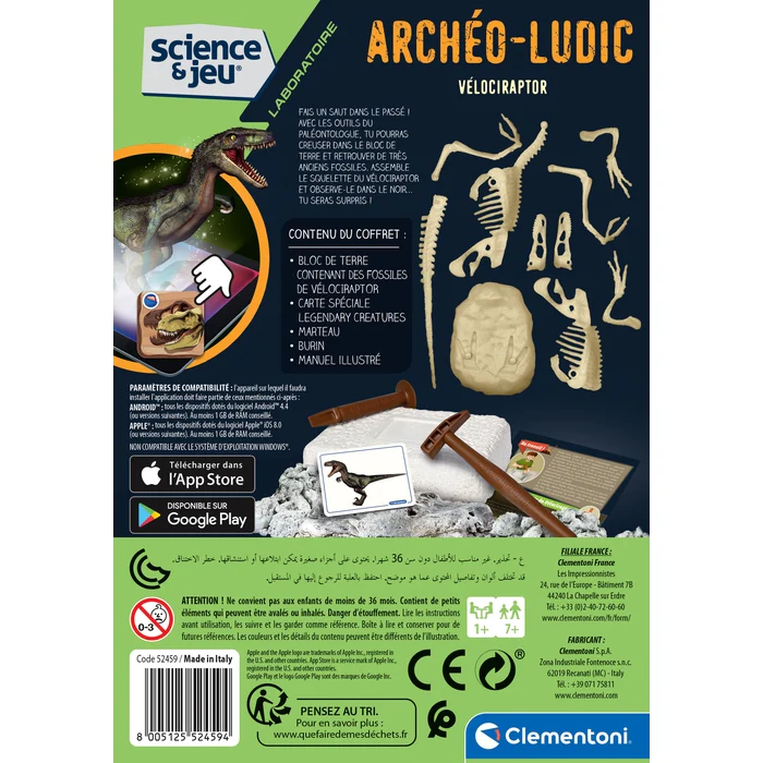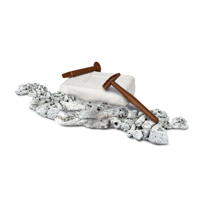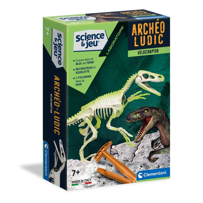 Casse la brique avec le marteau et le burin et découvre le squelette de l’incroyable vélociraptor. Fais revivre ce redoutable dinosaure !