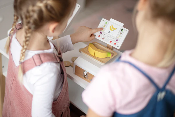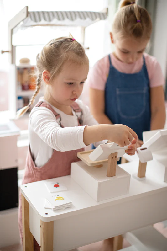 Description Peser comme au supermarché ! Cette balance en bois pour enfants avec un grand plateau de pesage est l’accessoire idéal pour peser les aliments dans le magasin de jeu ou dans la cuisine des enfants. Le mécanisme à ressort intégré garantit un plaisir de jeu particulièrement réaliste, car l’aiguille mobile et le plateau de […]