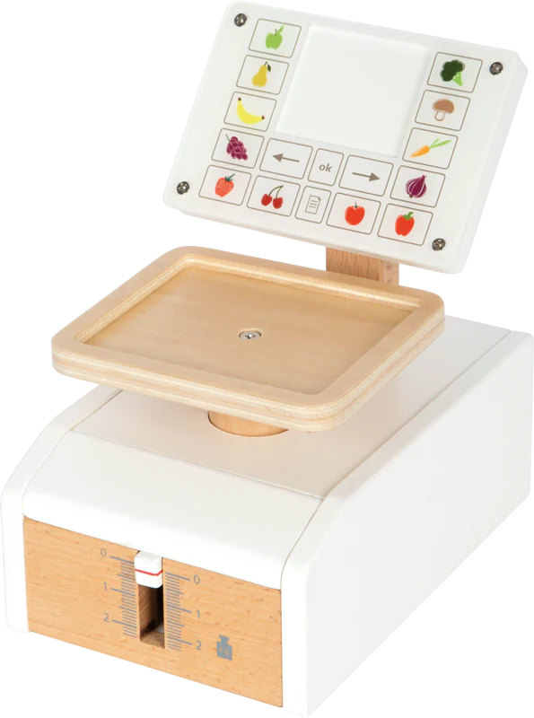 Peser comme au supermarché ! Cette balance en bois pour enfants avec un grand plateau de pesage est l’accessoire idéal pour peser les aliments dans le magasin de jeu ou dans la cuisine des enfants. Le mécanisme à ressort intégré garantit un plaisir de jeu particulièrement réaliste, car l’aiguille mobile et le plateau de la balance se déplacent de haut en bas lorsque l’on pose des aliments sur la balance. Le grand écran est recouvert d’une vitre en acrylique de haute qualité, sous laquelle sont imprimés différents panneaux de commande et des illustrations de fruits et légumes. Six cartes de produits imprimées recto-verso avec des illustrations de fruits et légumes complètent l’ensemble dejeu de rôle et peuvent être insérées par le haut dans la partie centrale de l’écran. Cette balance dejeu fait partie de la ligne de produits « fresh » et elle est une valeur sûre pour tout magasin de jeu ! Peser entraîne l’utilisation d’une balance et transmet de manière ludique une sensation des poids qui est visible grâce au plateau mobile de la balance. Pour que les enfants puissent également se faire une idée des différents prix, les cartes d’aliments sont munies d’illustrations de pièces de monnaie : plus il y a de pièces, plus le kilo de fruits ou de légumes pesé est cher. La finition de haute qualité avec dubois robuste et du verre acrylique fait de cette balance à peser un véritable accroche-regard dans la chambre d’enfant. Elle promet un amusement durable