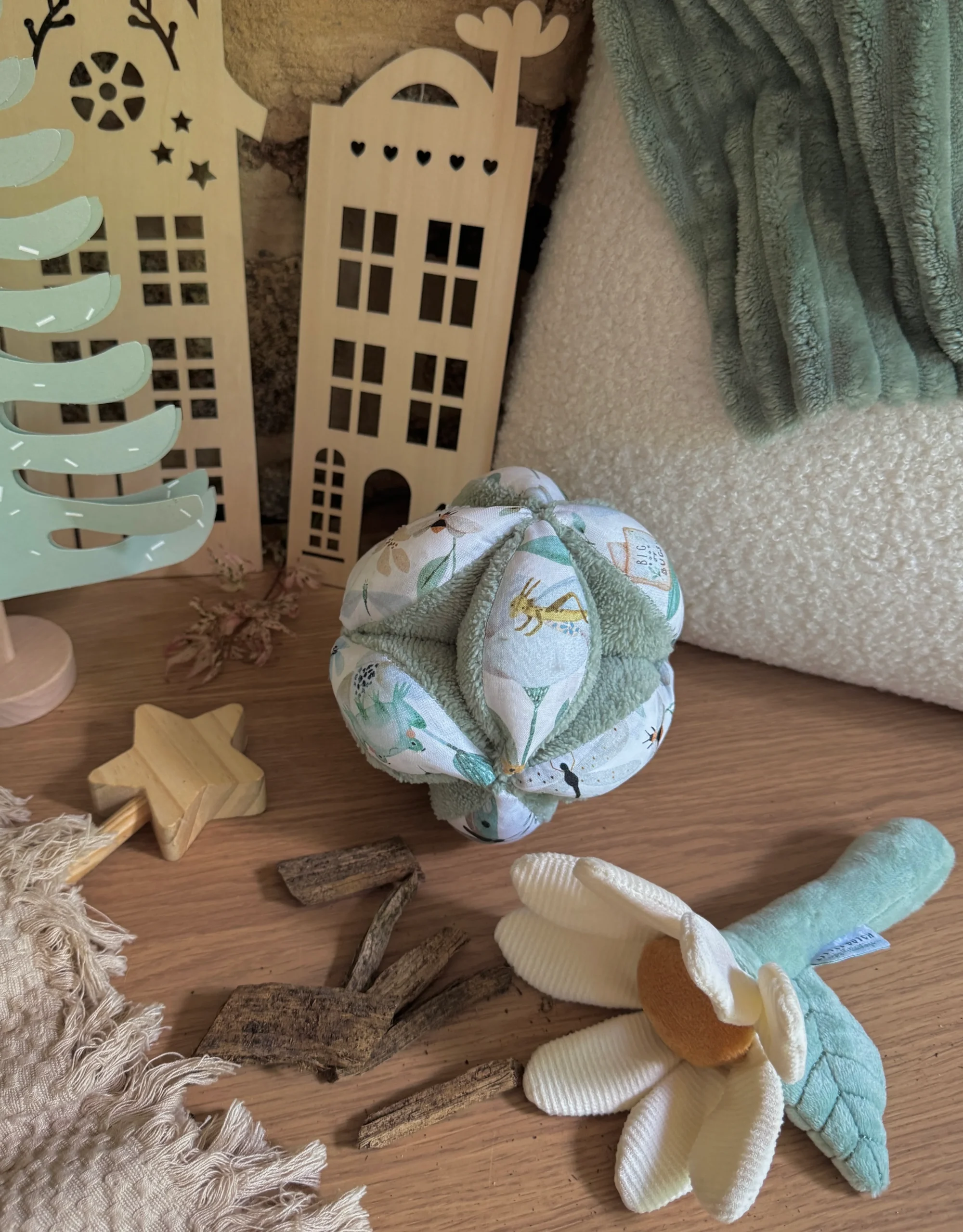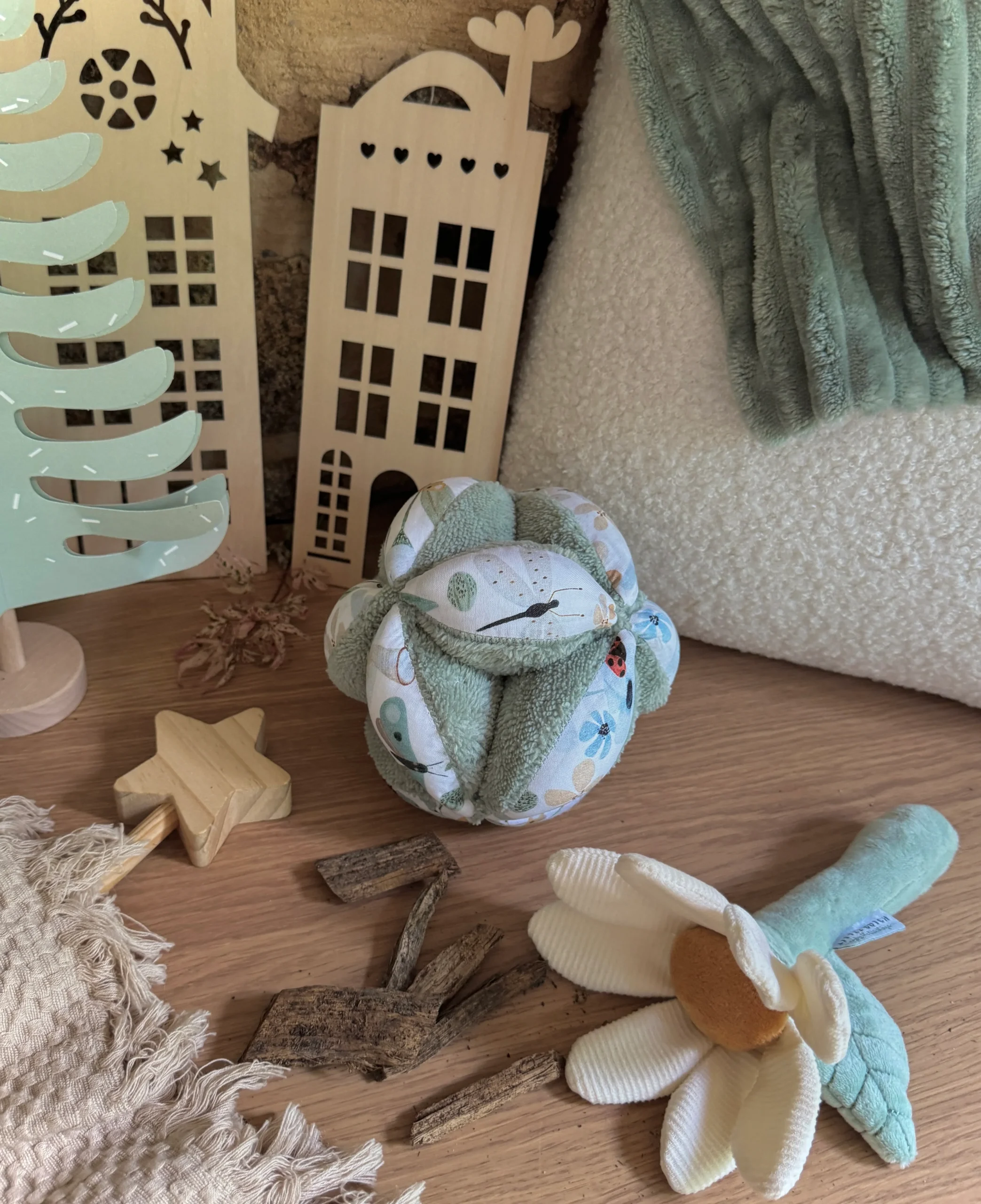 Pour ceux qui ne connaissent pas, cette balle permet à l’enfant de développer sa motricité fine. Quand votre Petit Loup commence à manifester le besoin de saisir un objet (vers 3 mois), vous pouvez l’accrocher à son mobile, pas trop haut, que bébé puisse s’entraîner à l’attraper.