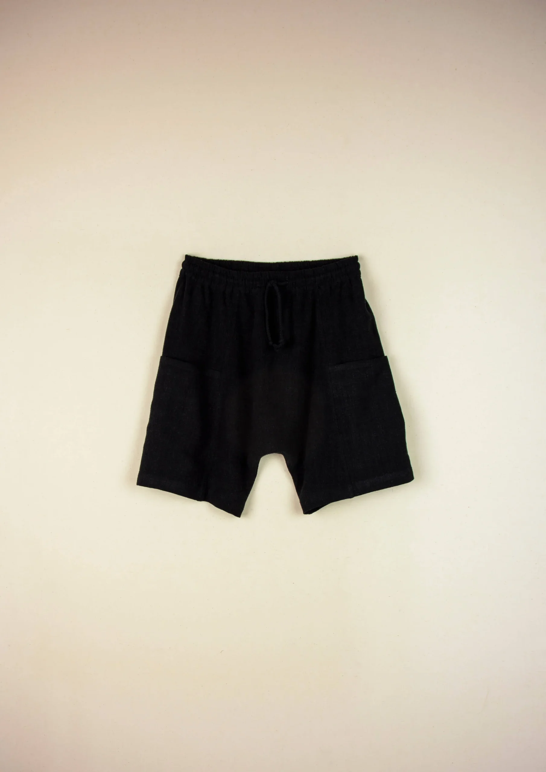 Bermuda noir taille basse avec poches latérales profondes et taille élastique avec cordon. A porter par exemple avec les chemises Pierrot.