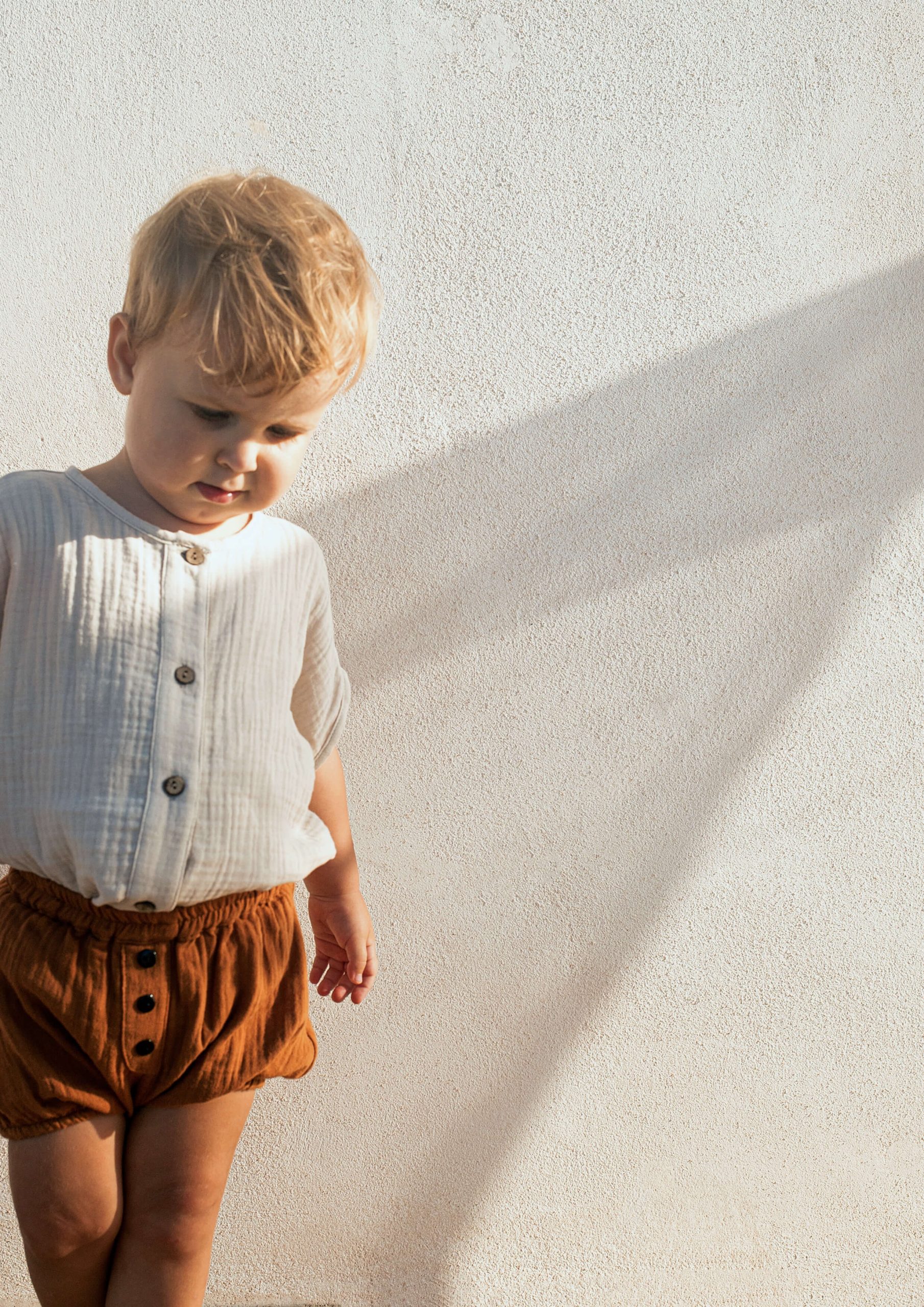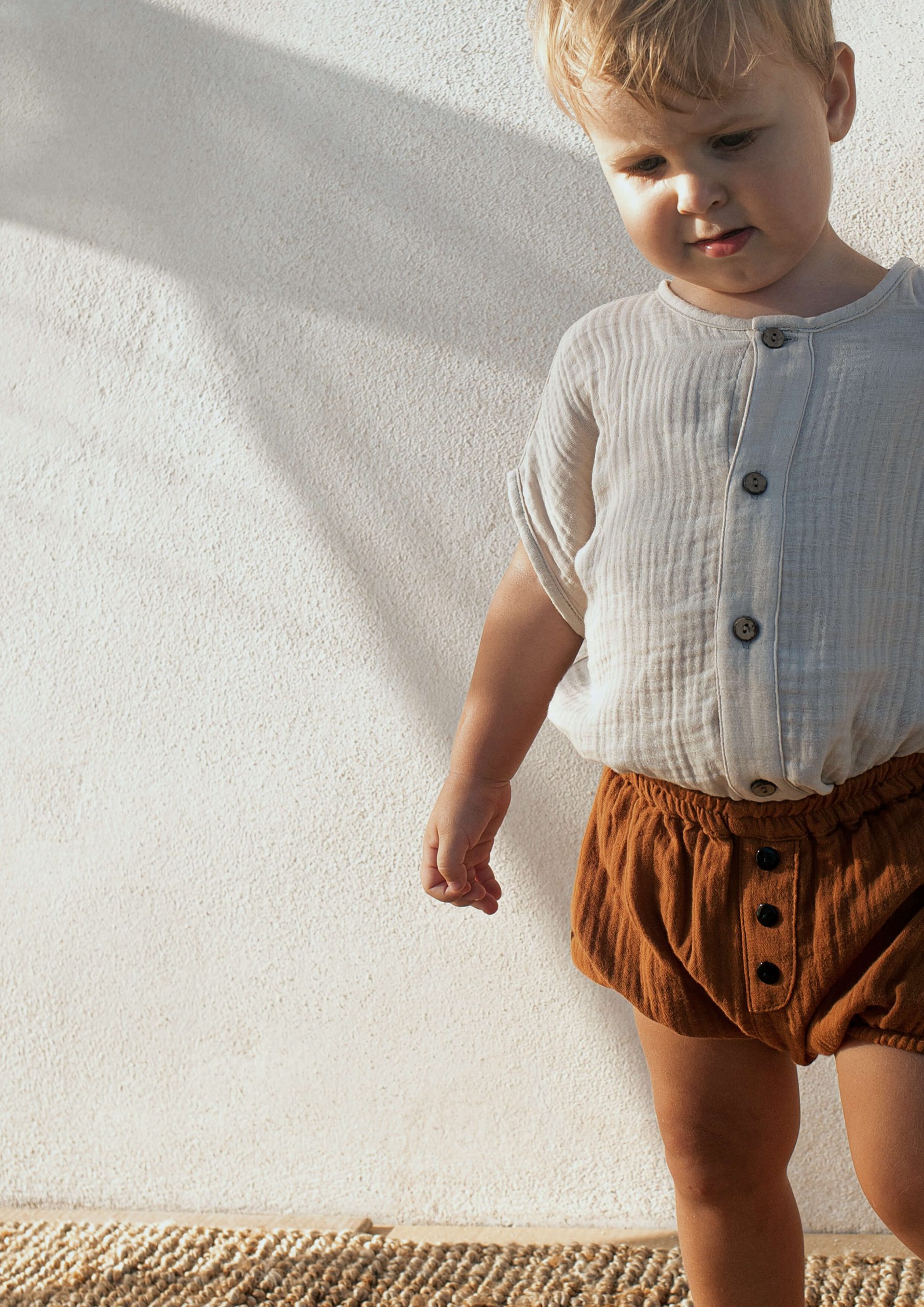 Culotte en gaze de coton couleur cannelle avec taille élastique. Le petit détail qu’on aime : les boutons sur le devant qui donnent un côté rétro au bloomer.
