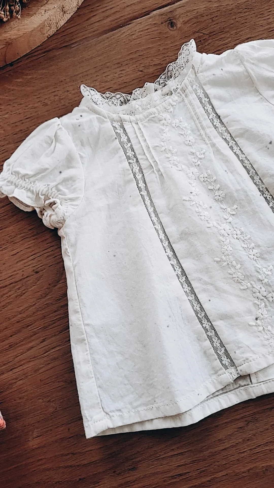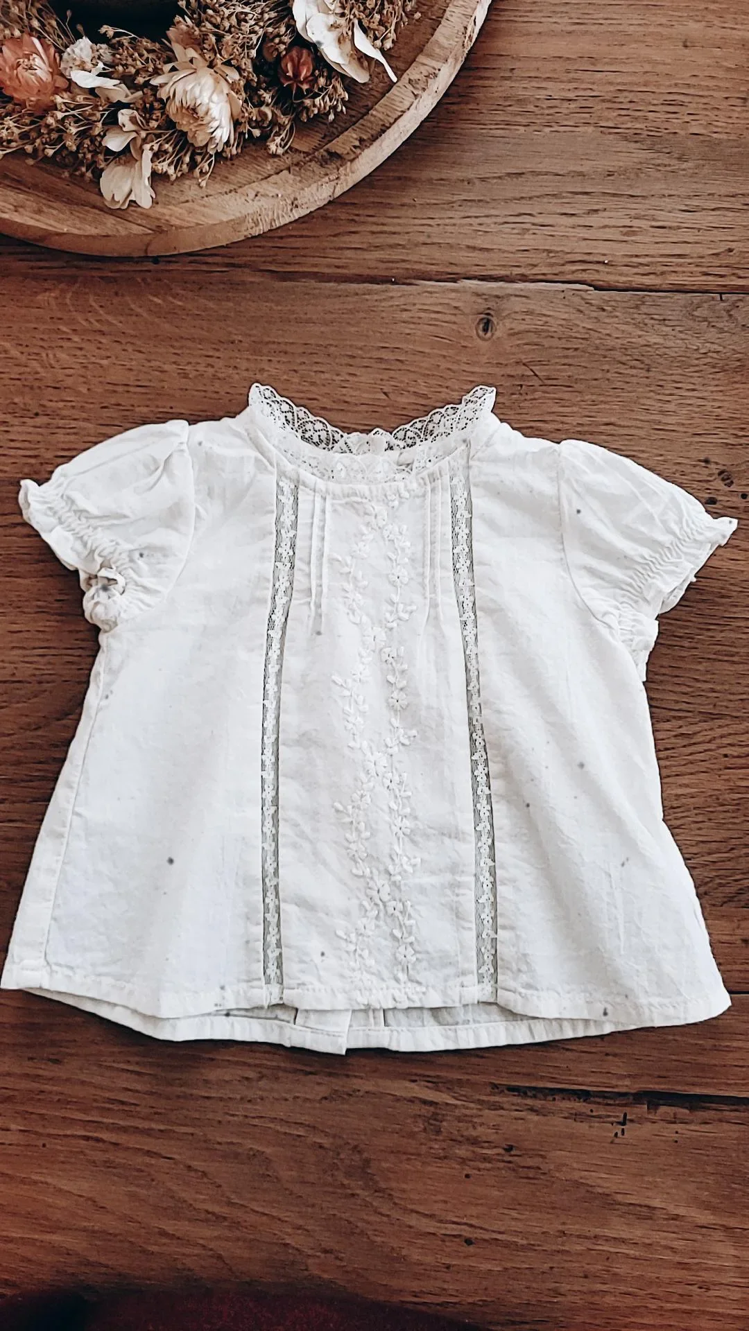 Blouse écrue style victorien alliant broderie florale et dentelle. Manches ballon courtes. Boutonnage à l’arrière. Peut se porter avec les Bloomers Mariette et Raviane pour un look estival tout en légèreté.
