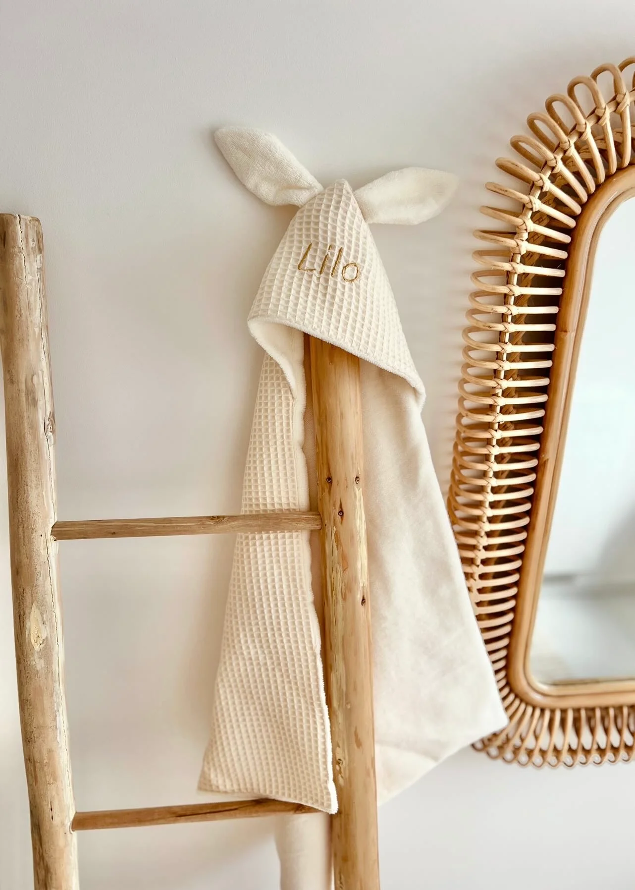 Voici une jolie cape de bain avec ses petites oreilles de lapin, qui lui donneront un air tout mignon.