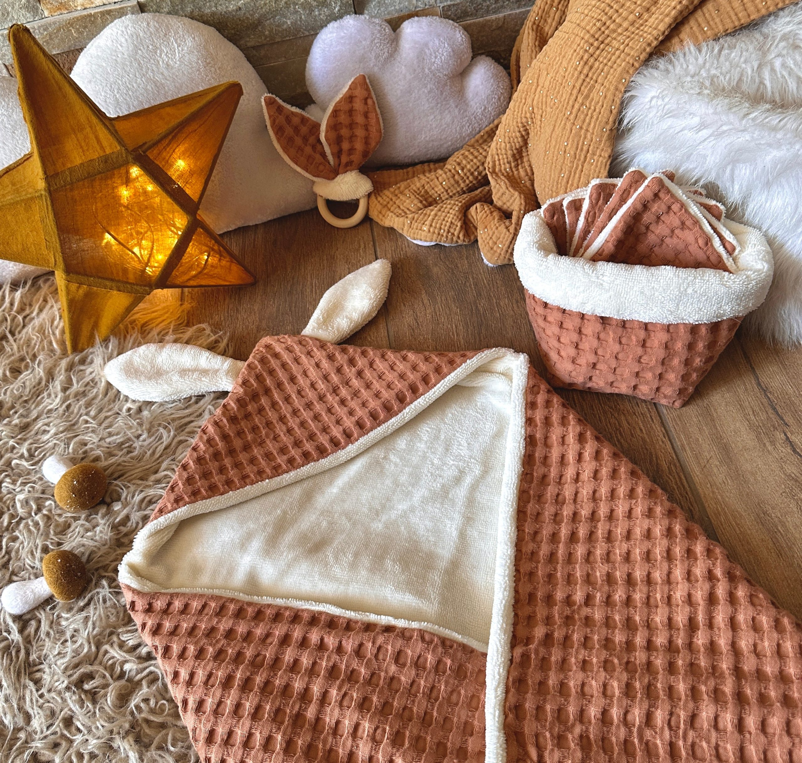 -La Cape de bain « Petit Bout’Chou » d’environ 75x75cm qui accompagnera bébé de la naissance jusqu’à ses 18-24 mois.