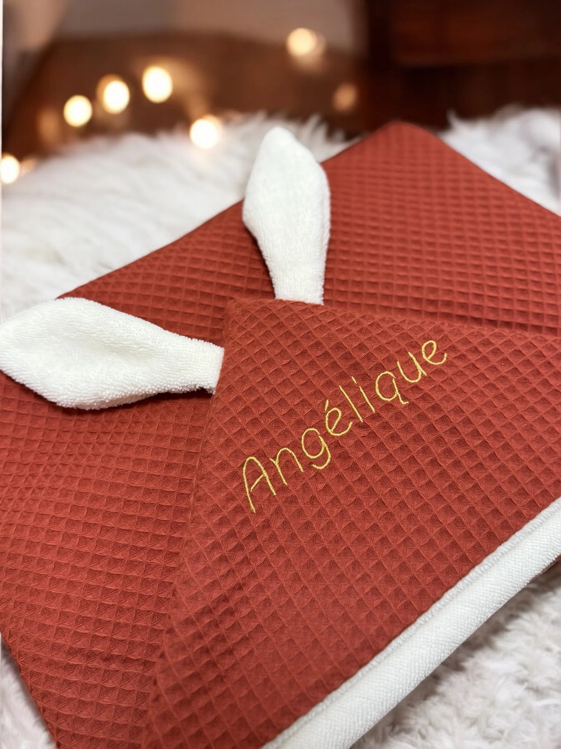 Si vous le souhaitez, je peux personnaliser la cape de bain en brodant le prénom de votre Petit Loup dans une couleur assortie directement sur la capuche.