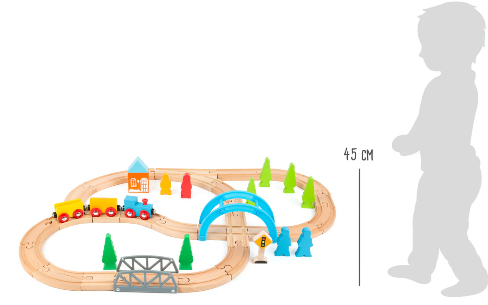Un monde ferroviaire pour les petits explorateurs! Avec cet ensemble de chemin de fer en bois, comprenant un ensemble complet d´accessoires, les petits cheminots en auront pour leur compte. Ici, le chemin de fer passe par des ponts et des vallées et emprunte toujours un nouveau chemin à travers les différents carrefours de voies ferrées. Les rails en bois sont compatibles avec tous les rails disponibles dans le commerce. Ce plaisir de jeu créatif ne doit manquer dans aucune pépinière.
