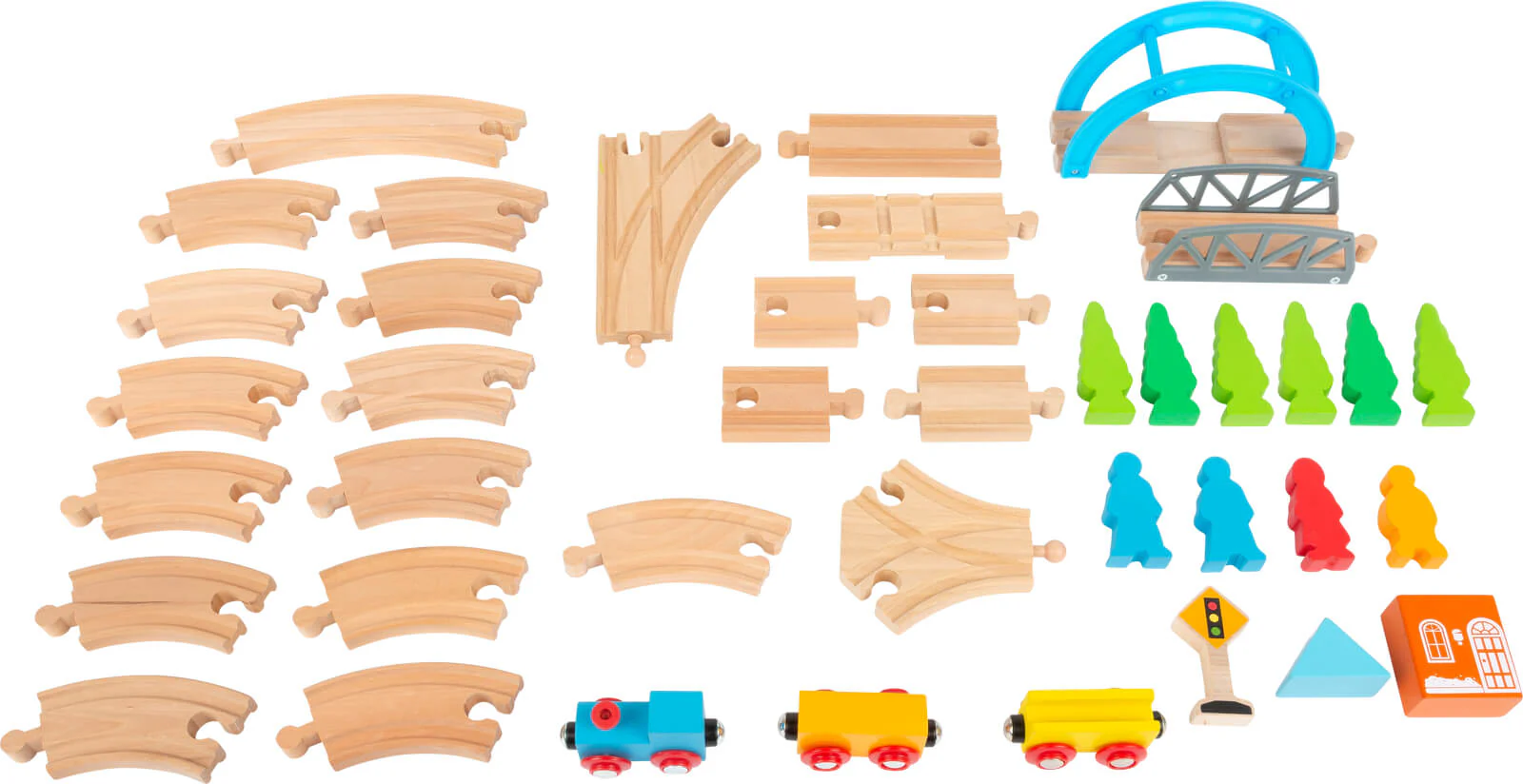 1 locomotive, 2 wagons, 1 feu de signalisation, 1 maison, 1 toit, 6 arbres, 4 figurines, 2 ponts, 22 rails