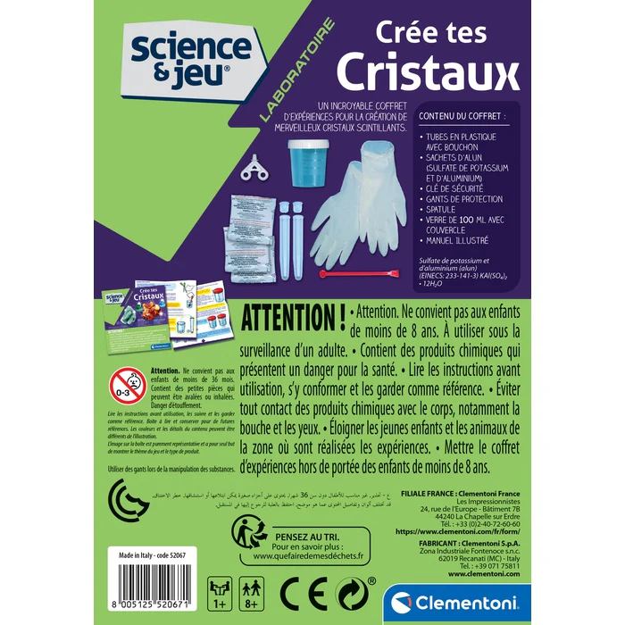 Un mini coffret d’expérimentation pour créer de merveilleux cristaux scintillants. Un jeu unique pour découvrir les réactions chimiques des sels et créer des formes étincelantes ! Contient 3 sachets d’alun (sulfate d’aluminium et potassium).