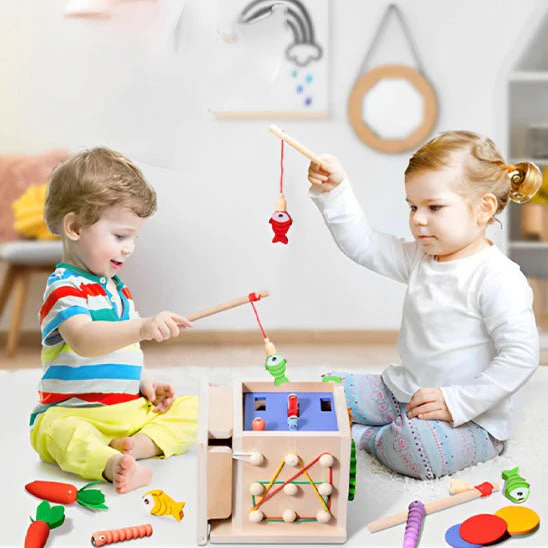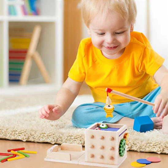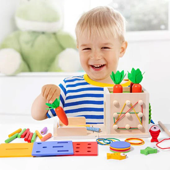 Les activités variées de notre cube en bois sollicitent différents sens de votre enfant. Le toucher des textures du bois, la vision des couleurs vives, et l’ouïe des sons produits par les pièces en mouvement contribuent à une expérience sensorielle riche et complète, essentielle au développement cognitif.