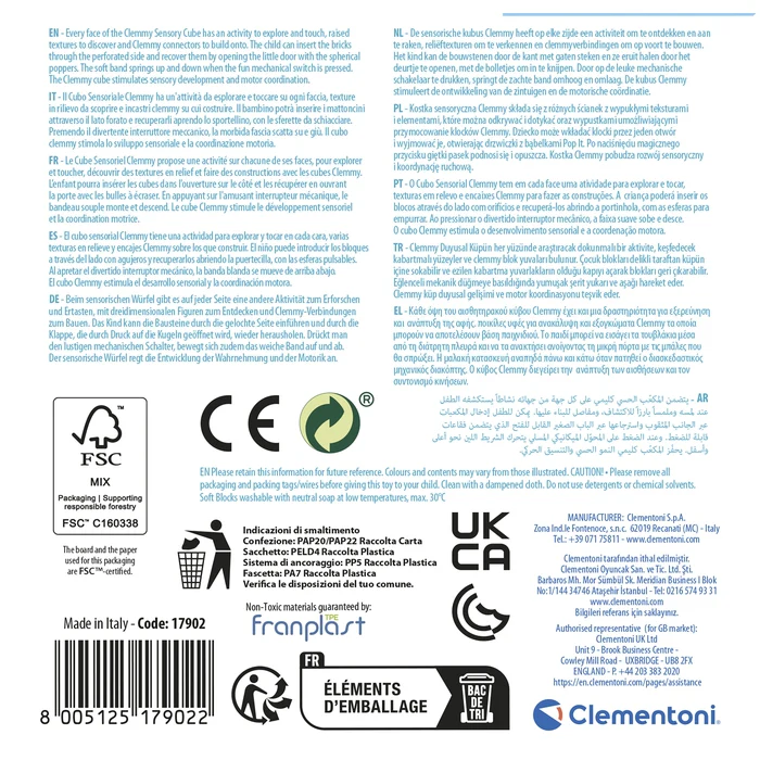Un cube avec 5 faces de jeu, riche en textures à explorer, pour jouer avec les cubes souples Clemmy. Avec les 5 faces, l’enfant pourra empiler les cubes ou les insérer à l’intérieur du cube à travers les inserts souples. Contient 4 cubes souples Clemmy. Les cubes Clemmy sont parfaits pour favoriser le développement multisensoriel de l’enfant.