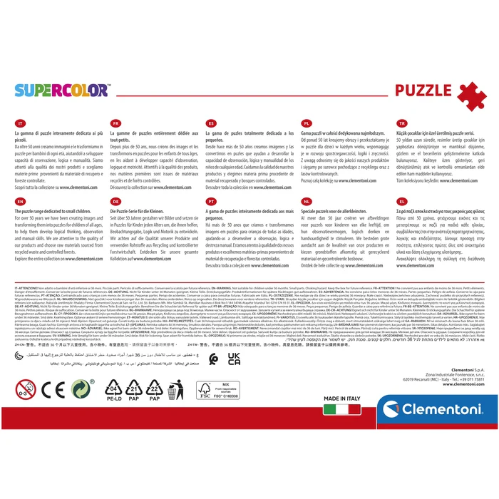 Depuis toujours sensible au problème de l’écologie, Clementoni utilise beaucoup de matériaux recyclés, évitant l’emploi de composants polluants. Made in Italy.