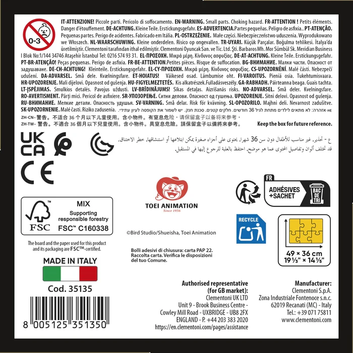 Depuis toujours sensible au problème de l’écologie, Clementoni utilise beaucoup de matériaux recyclés, évitant l’emploi de composants polluants. Made in Italy.