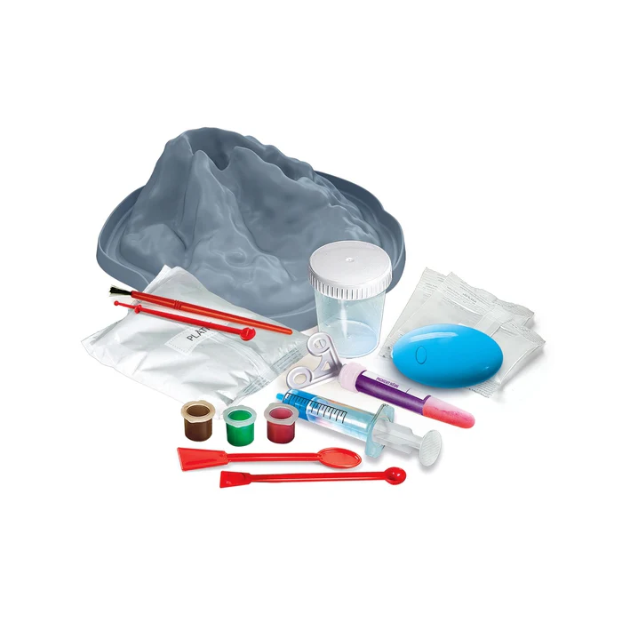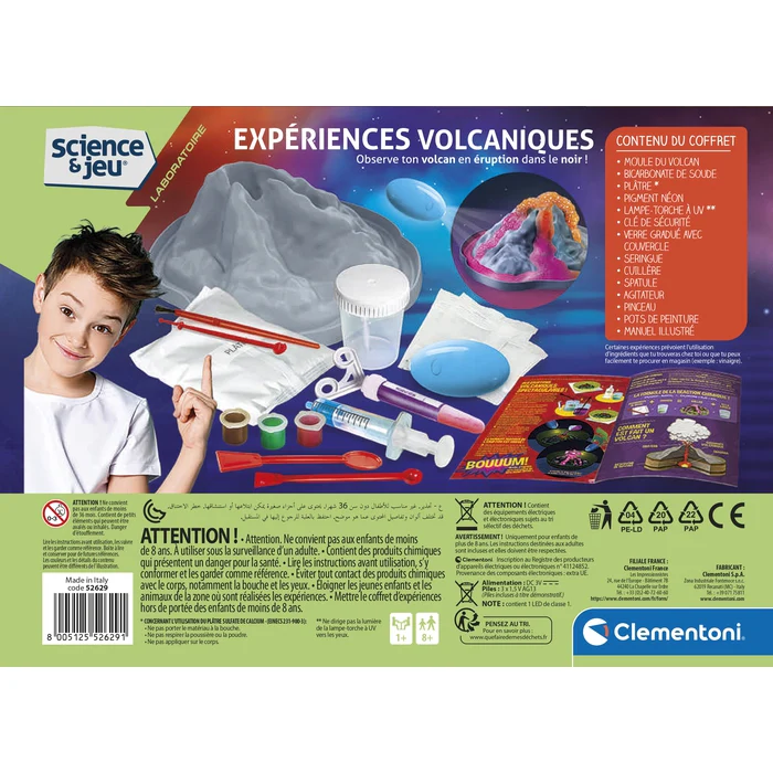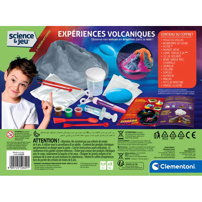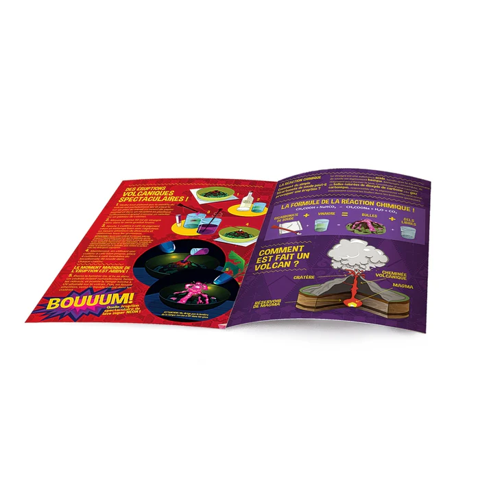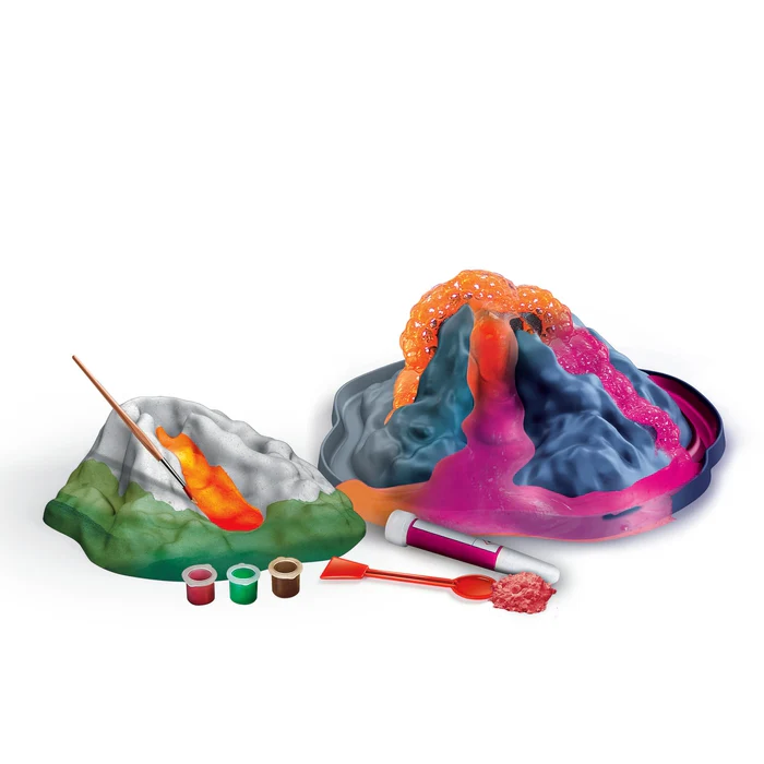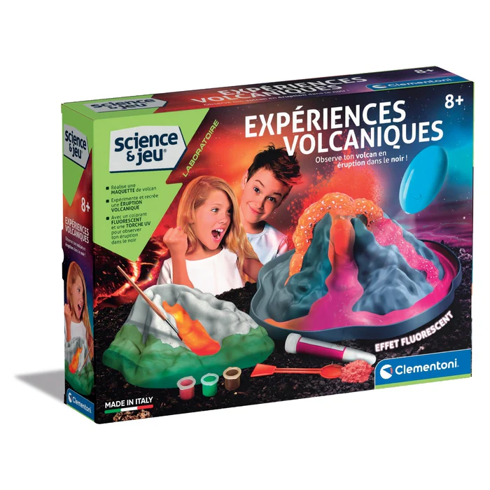 Le jeu contient : plâtre et moule pour fabriquer le volcan, peintures pour le colorier, bicarbonate, lampe-torche à UV et un pigment néon pour réaliser des éruptions surprenantes !