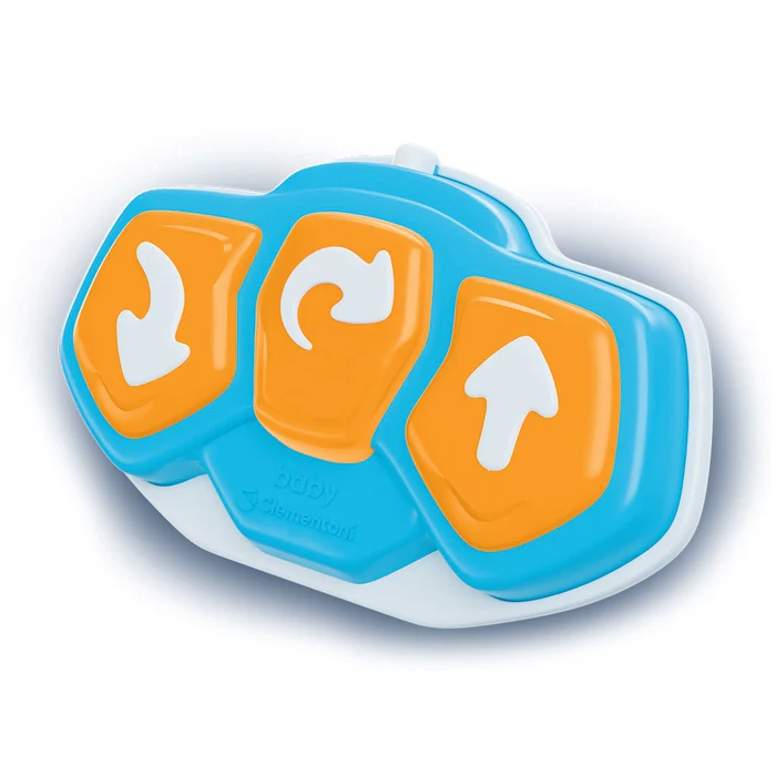 La radiocommande présente trois boutons : avant, arrière et pirouette ! Sur le coffre de la voiture se trouve un bouton interactif.