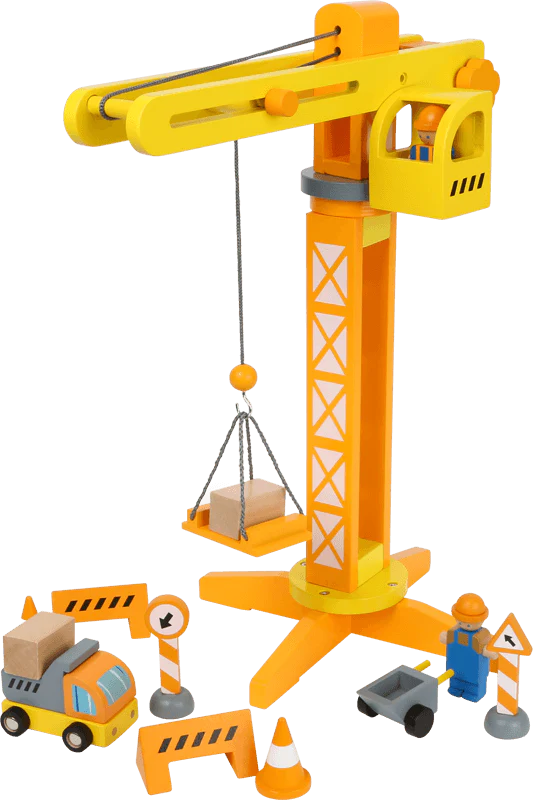 Grue de chantier robuste en bois avec rotation à 360° et flèche mobile comprenant un crochet pour le transport de marchandises. Les petits ouvriers peuvent sécuriser le chantier avec des petits chapeaux, des panneaux et des barrières. Dans la nacelle, le grutier coordonne la zone de transport qui est descendue en toute sécurité à l’aide de la manivelle et de la corde. Enfin la fin de la journée ! Une fois le travail terminé, le grutier qui travaille dur peut quitter son poste de travail par l’échelle interne. Le kit de grue en bois robuste avec ses nombreux accessoires offre un grand plaisir de jeu et soutient les petits grutiers dans leurs jeux de rôle. Qui veut goûter à l’air du chantier
