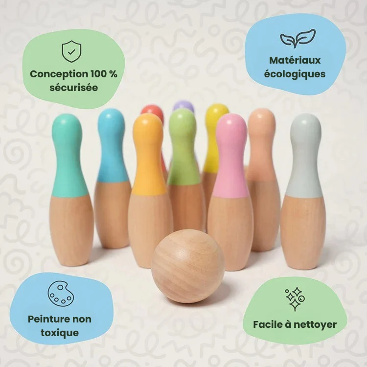 🌈 Comprend 10 quilles colorées et 2 boules en bois, idéales pour les petites mains.