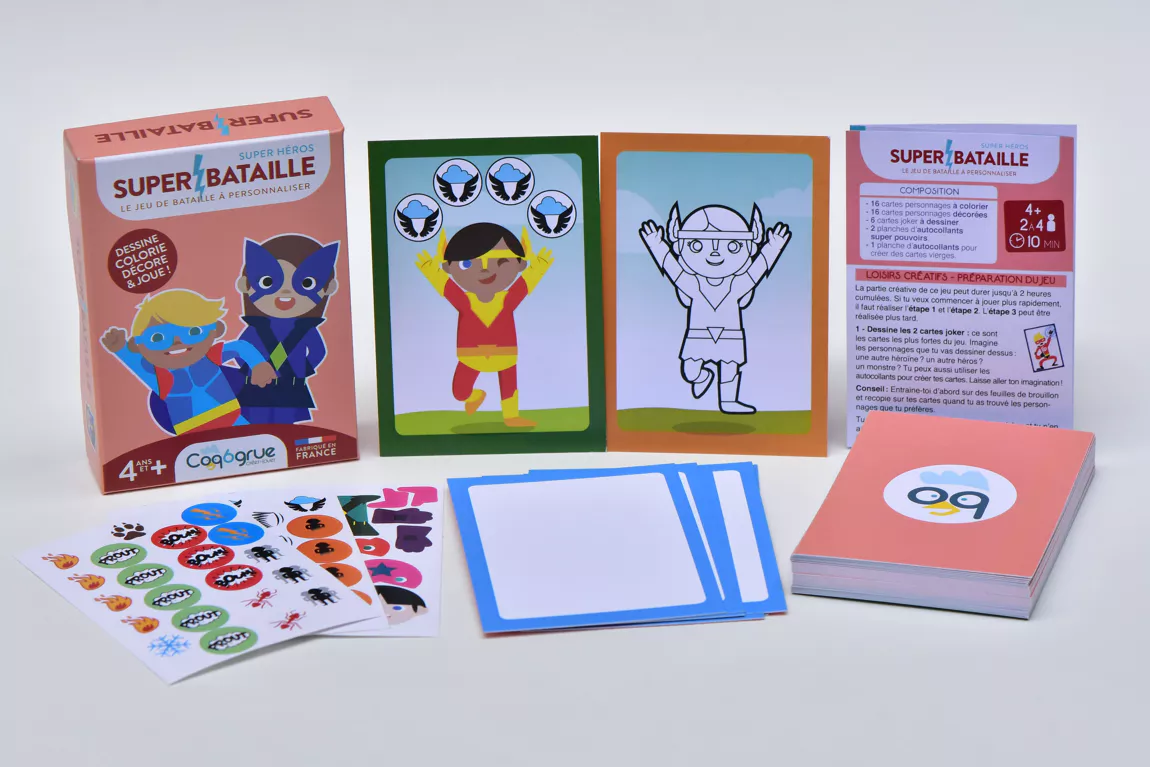 L’incontournable jeu de bataille associé à des loisirs créatifs ! Un jeu de cartes à colorier, dessiner et décorer avec des autocollants, qui fait la fierté des enfants…et de leurs parents !!