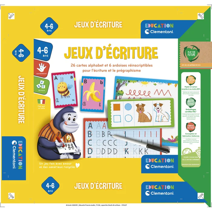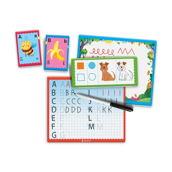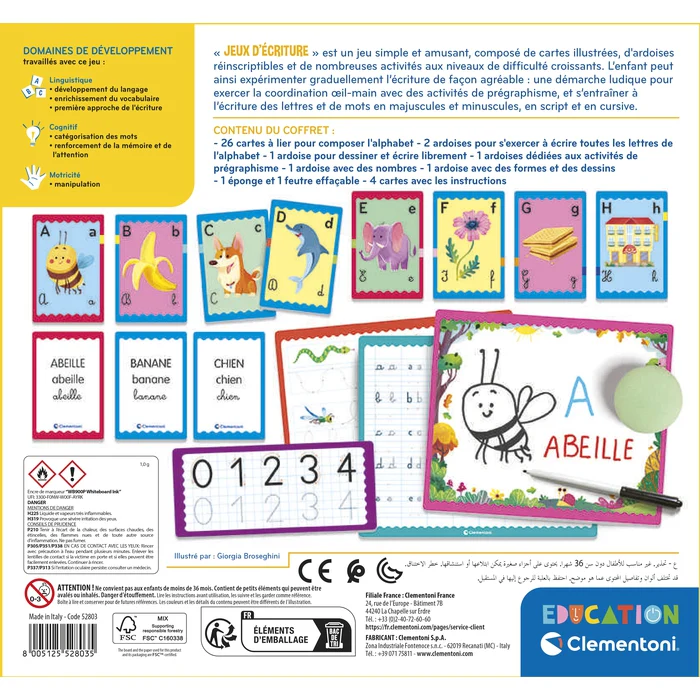 Un coffret amusant contenant 26 cartes illustrées, 3 ardoises, un feutre et une éponge pour apprendre à écrire.