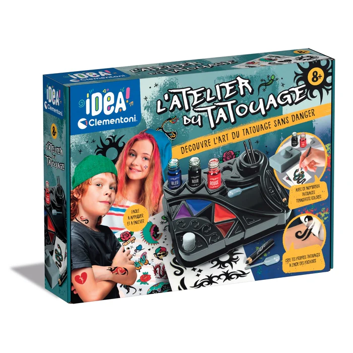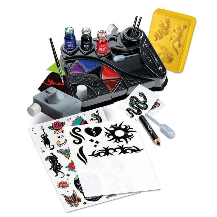 Contient une base de travail, des pinceaux, des colorants liquides et des pochoirs pour réaliser des tatouages à main levée comme un vrai tatoueur !