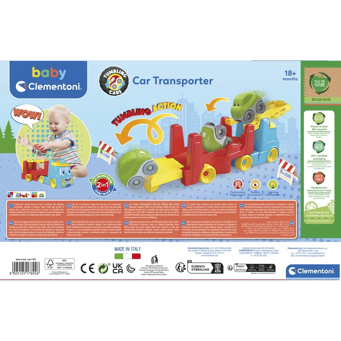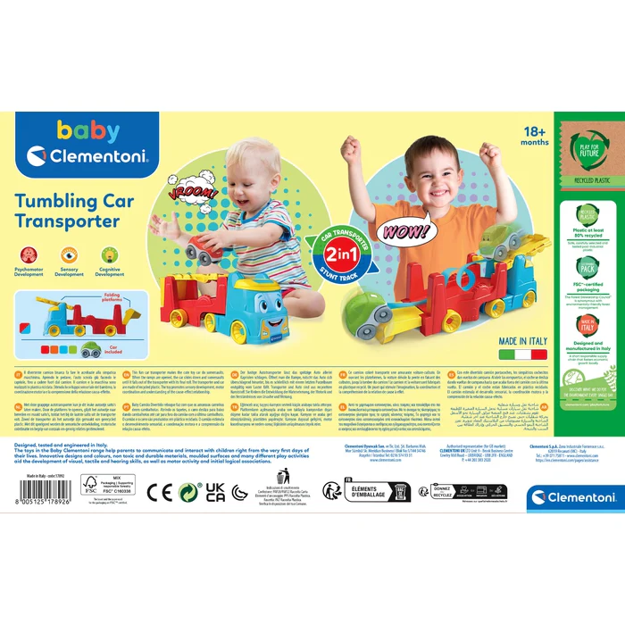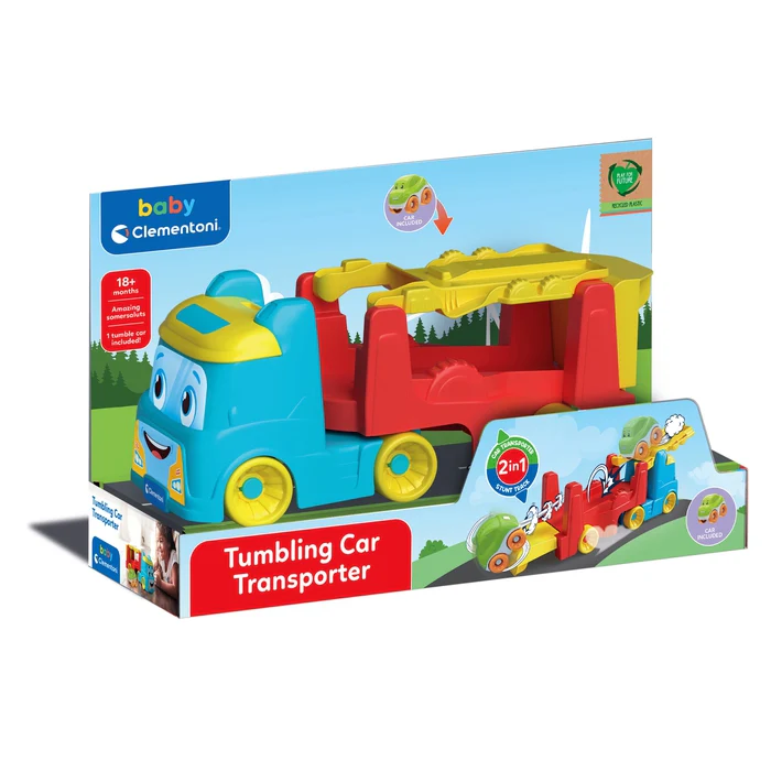 Le wagonnet devient une piste pour jouer avec le véhicule inclus, qui se retourne et fait des culbutes amusantes, stimulant la curiosité de l’enfant.