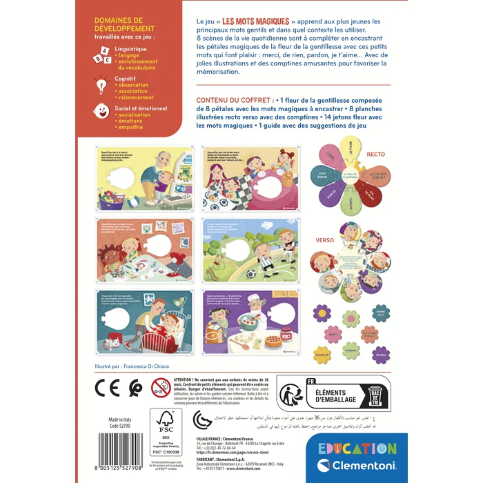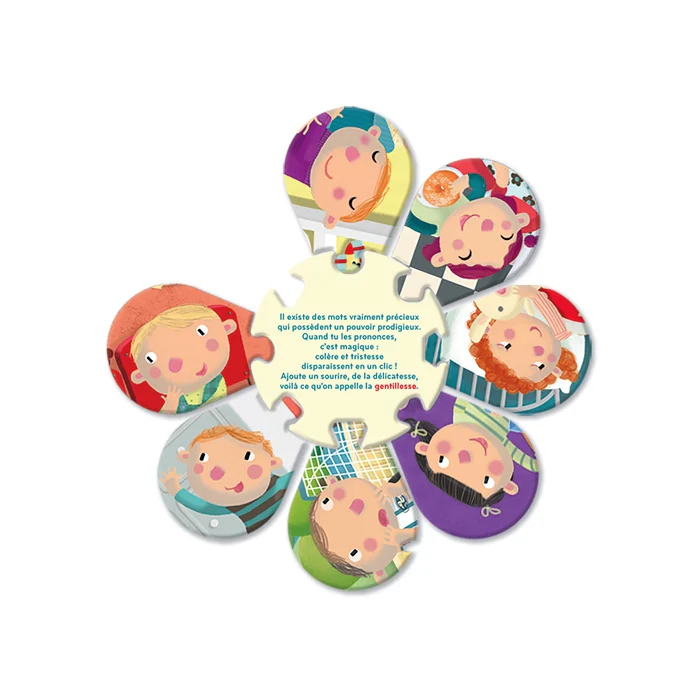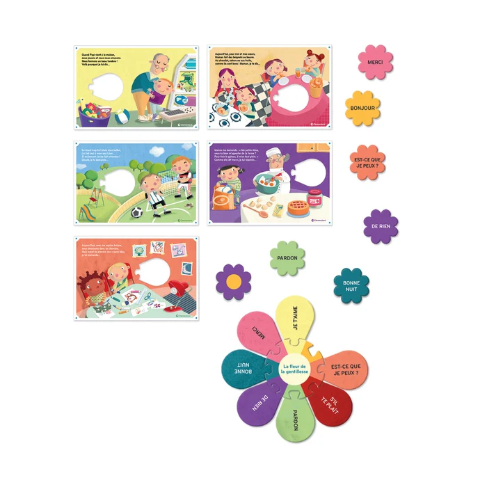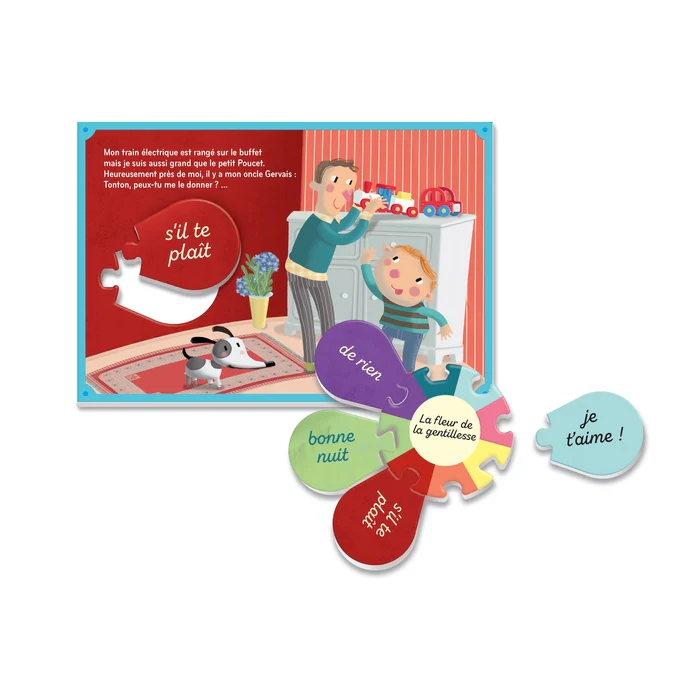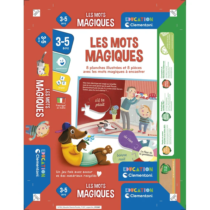 Un jeu qui enseigne les mots magiques et dans quel contexte les utiliser. Contient 8 scènes sur des cartes recto-verso avec des situations de la vie quotidienne familières à l’enfant : au recto une image évocatrice et au dos une comptine dont il manque le dernier mot. L’enfant place la pièce avec le mot magique […]