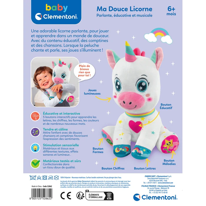 Cette jolie licorne le divertira avec des effets sonores et lumineux et lui fera découvrir les lettres, les chiffres, les formes et les couleurs de manière simple et captivante.