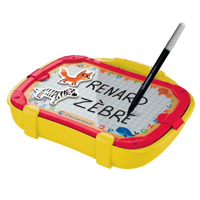 L’ardoise sur laquelle sont collés les aimants présente un côté sur lequel l’enfant peut écrire avec le feutre effaçable fourni.