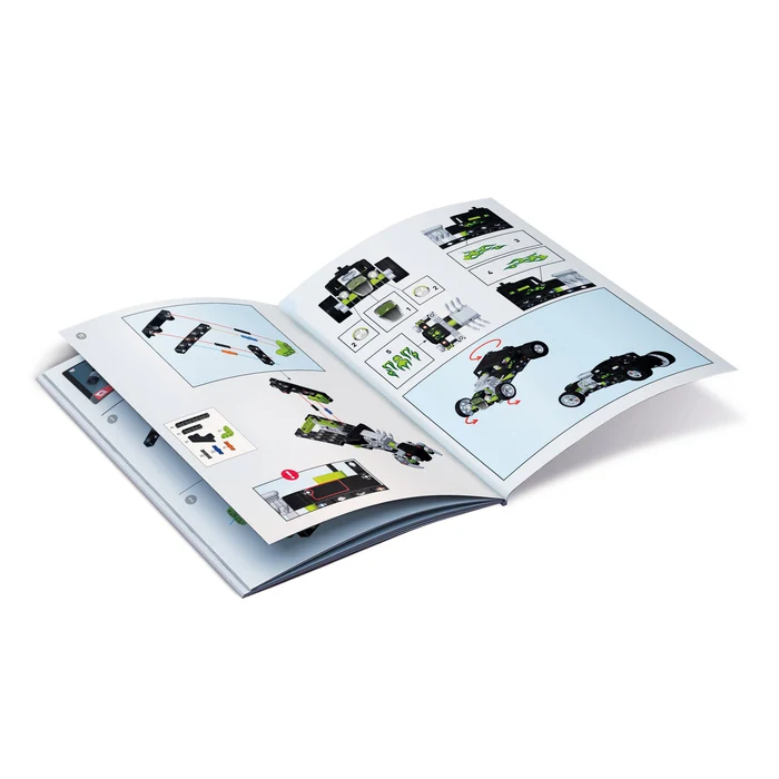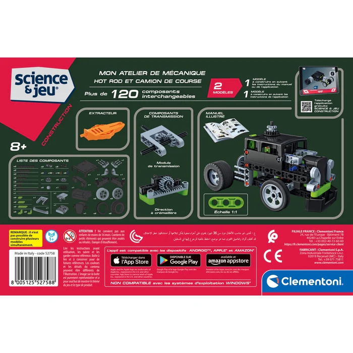 Le coffret contient plus de 120 pièces pour construire les 2 modèles équipés de mécanismes de transmission, d’engrenages…