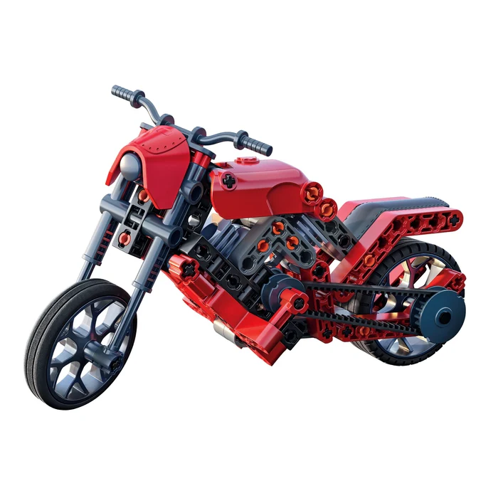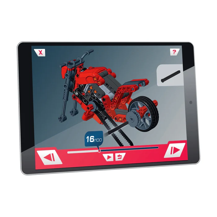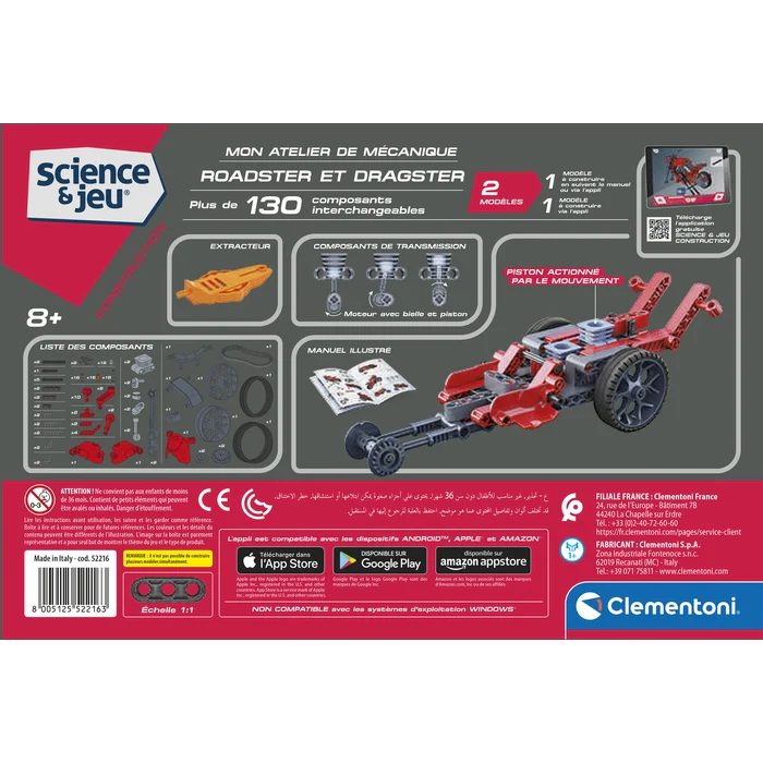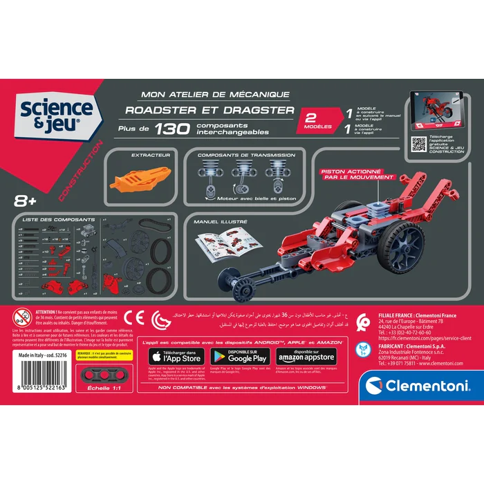 Un coffret scientifique innovant pour découvrir les secrets de ces 2 véhicules surpuissants. L’enfant construit lui-même un roadster et un dragster en intégrant leur système de transmission. Plus de 130 composants sont inclus : boîte de vitesses, engrenages, jantes, pneus, élastiques, barres, poulies, etc.