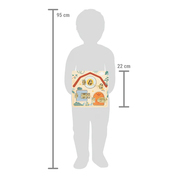 Fermer, ouvrir, découvrir ! Cette planche de motricité en bois, conçue avec amour, offre aux jeunes enfants de multiples possibilités de jeu et d’apprentissage. La planche d’apprentissage au look exotique « safari » dispose de deux fenêtres et d’une porte dotées de différentes fermetures qui laissent entrevoir d’adorables animaux. En ouvrant et en fermant le verrou, le crochet de porte et le loquet, les enfants apprennent des compétences pratiques quotidiennes et développent leurs capacités motrices fines. Un jouet Montessori formidable qui entraîne de manière ludique la préhension ainsi que la coordination œil-main et stimule la motricité de manière optimale. Le design en forme de maison et l’aspect coloré combiné au bois naturel font de cette planche de motricité un favori absolu dans la chambre d’enfant