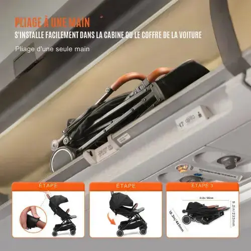 • Pliage à une main : le pliage et le rangement peuvent être complétés en une seule traction, avec des dimensions de 18,3 x 22,2 x 9,2 pouces / 465 x 565 x 233 mm, adapté au stockage et à l’utilisation à Disneyland, dans les coffres à bagages des avions et dans les coffres de voiture.