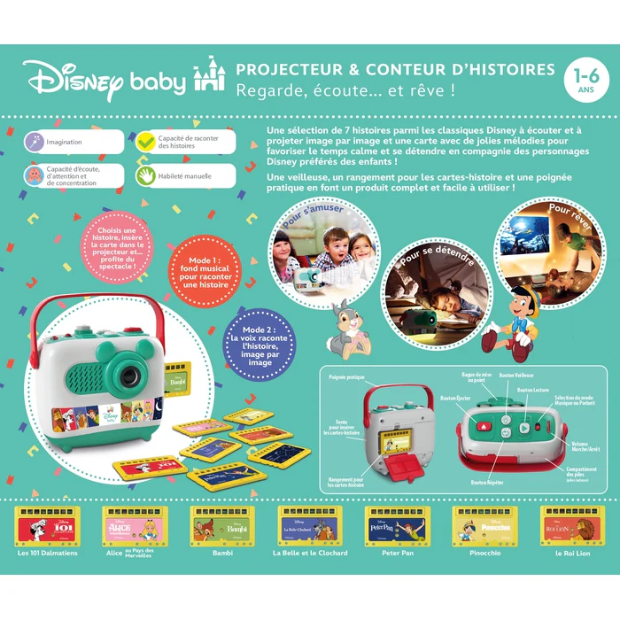 Un conteur d’histoires innovant, avec un projecteur pour captiver l’enfant pendant l’écoute avec les images des personnages classiques de Disney.