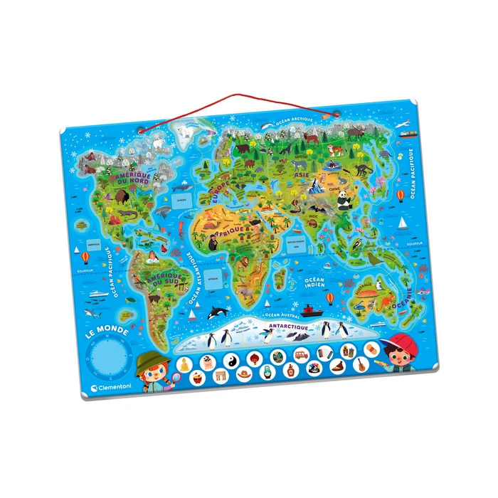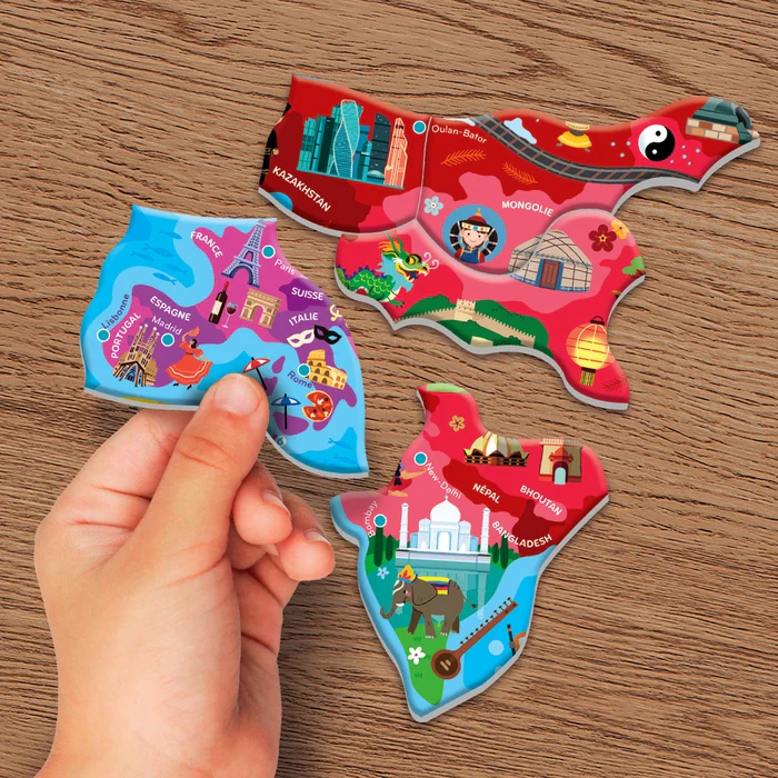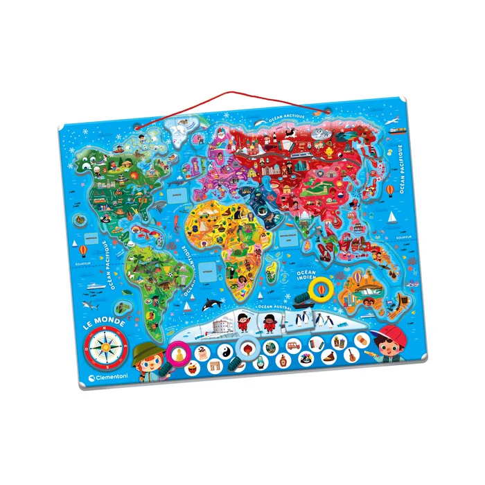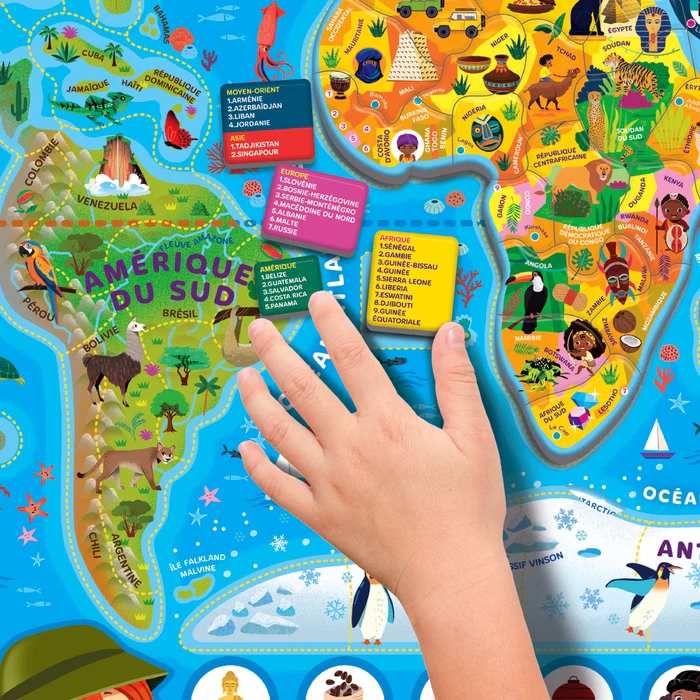 Un puzzle magnétique coloré pour recomposer le planisphère du monde avec un jeu d’observation pour découvrir les particularités de chaque continent.