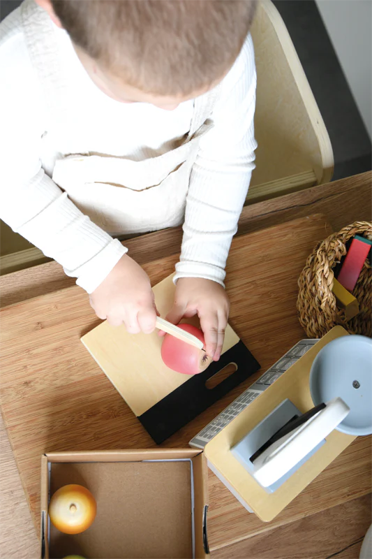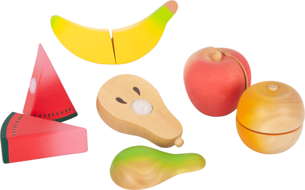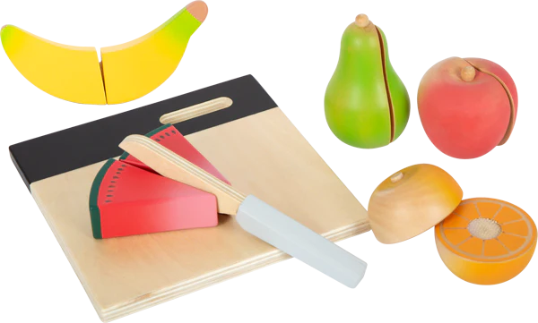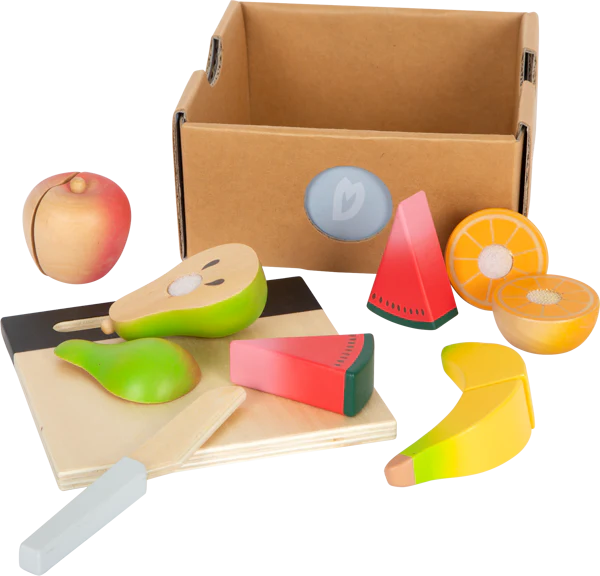 Ce set de fruits à découper en bois robuste permet de jouer dans la cuisine des enfants de manière particulièrement réaliste. Le set de fruits est composé de fruits que les enfants connaissent dans leur vie quotidienne. Comprend une planche à découper et un couteau en bois ainsi qu’un emballage réutilisable qui peut servir de caisse de rangement. La partie supérieure de la planche à découper est inscriptible à la craie ! Avec ce set d’aliments ludiques, l’exercice des compétences quotidiennes est particulièrement amusant – surtout le maniement du couteau ! Planche à découper, couteau en bois, pomme, poire, orange, banane, morceau de melon – rien ne manque dans ce set de jeu ! L’aspect naturel des aliments, maintenus ensemble par des points de Velcro, rend le jeu de rôle dans la cuisine des enfants et le magasin particulièrement réaliste. Plus : L’emballage apprend aux enfants de manière ludique à ménager les ressources – car il n’est pas jeté, mais réutilisé – fidèle à la méga-tendance mondiale : reduce, reuse and recycle ! Plus : la planche à découper peut être facilement suspendue grâce à l’encoche en haut
