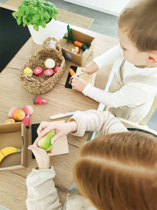 Description Ce set de fruits à découper en bois robuste permet de jouer dans la cuisine des enfants de manière particulièrement réaliste. Le set de fruits est composé de fruits que les enfants connaissent dans leur vie quotidienne. Comprend une planche à découper et un couteau en bois ainsi qu’un emballage réutilisable qui peut servir […]