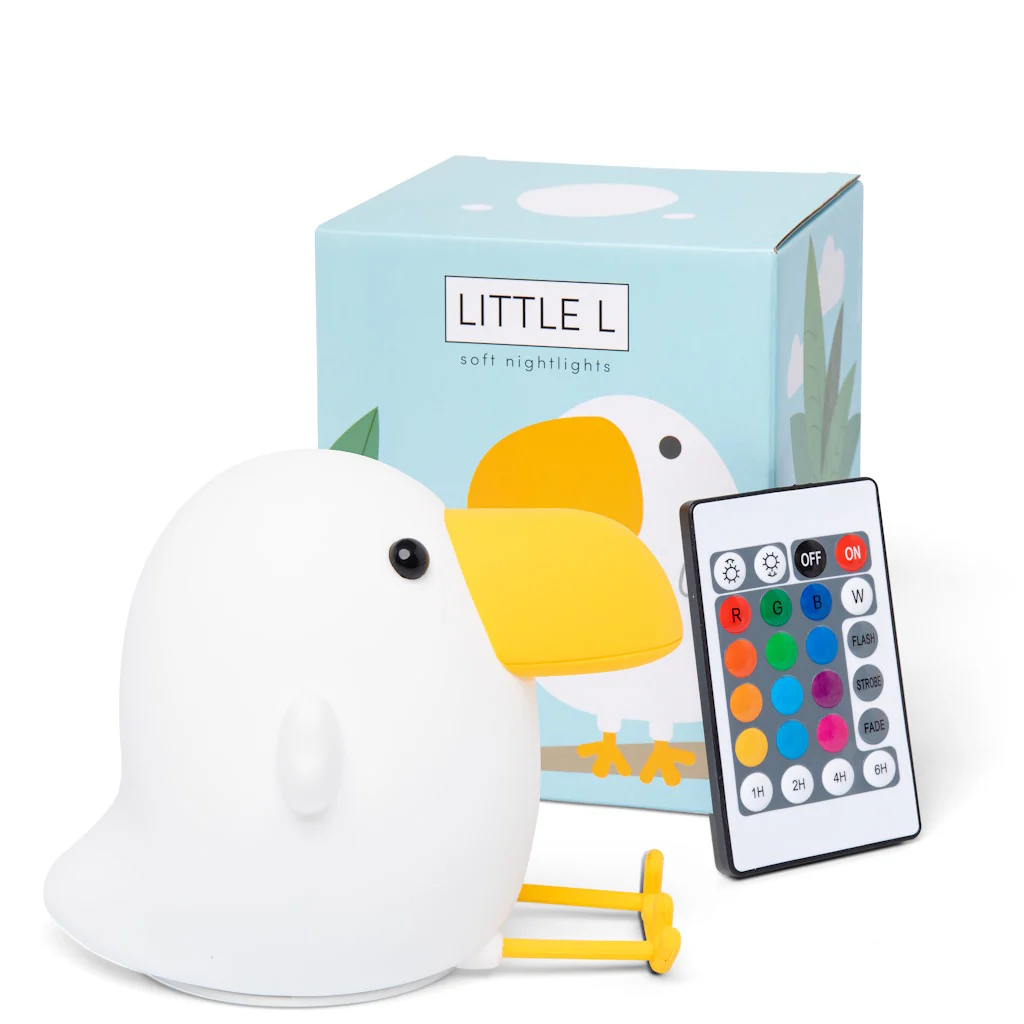 La veilleuse est rechargeable par USB et réglable grâce à une télécommande.