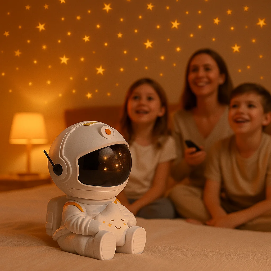 L’obscurité est souvent source d’inquiétude pour les enfants sensibles. La veilleuse projection en forme de petit astronaute diffuse une lumière douce et colorée qui remplace les zones sombres par une atmosphère rassurante et magique. Les projections de nébuleuses et d’étoiles stimulent visuellement l’enfant, mais de manière organisée, lente et prévisible — parfait pour réduire le stress.