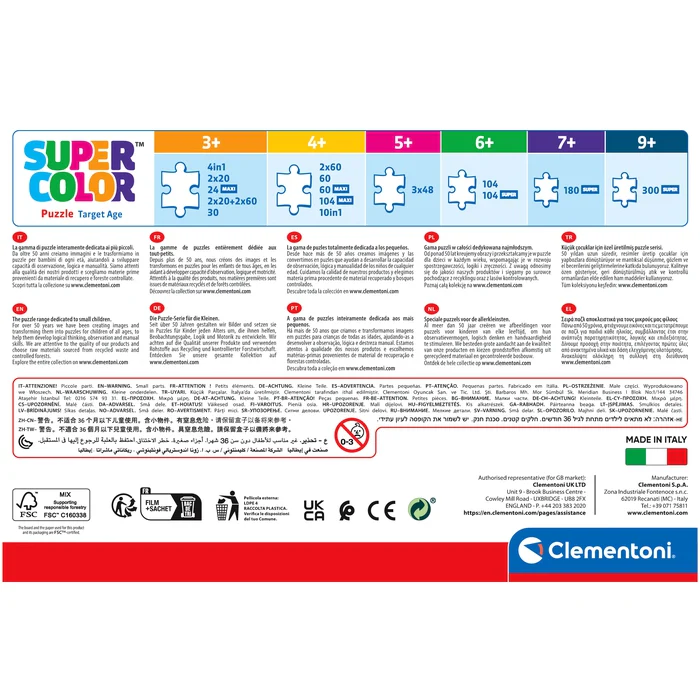 Contient : 1 puzzle de 12 pièces, 1 puzzle de 16 pièces, 1 puzzle de 20 pièces et 1 puzzle de 24 pièces.