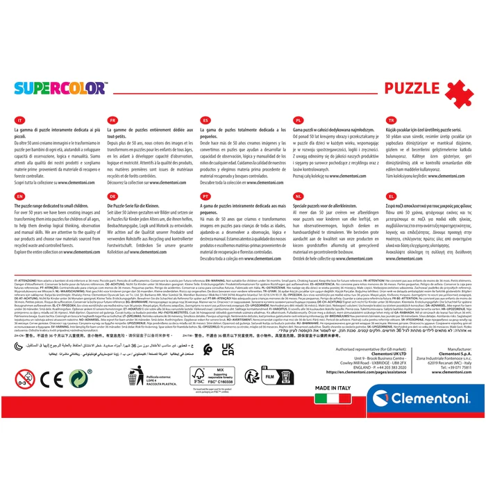 Depuis toujours sensible au problème de l’écologie, Clementoni utilise beaucoup de matériaux recyclés, évitant l’emploi de composants polluants. Made in Italy.