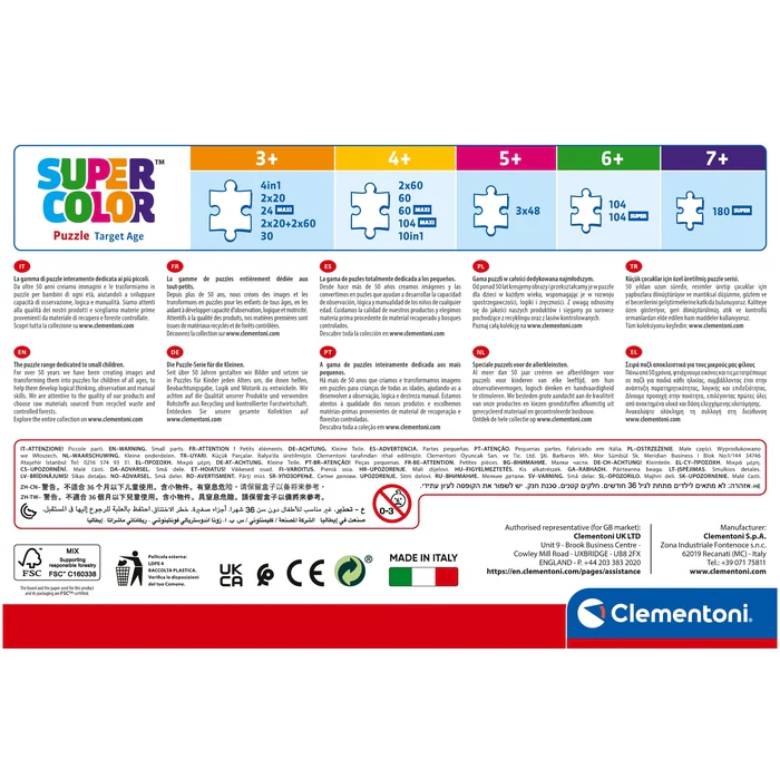 Depuis toujours sensible au problème de l’écologie, Clementoni utilise beaucoup de matériaux recyclés, évitant l’emploi de composants polluants. Made in Italy.