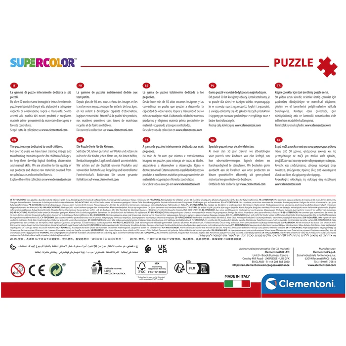 Depuis toujours sensible au problème de l’écologie, Clementoni utilise beaucoup de matériaux recyclés, évitant l’emploi de composants polluants. Made in Italy.