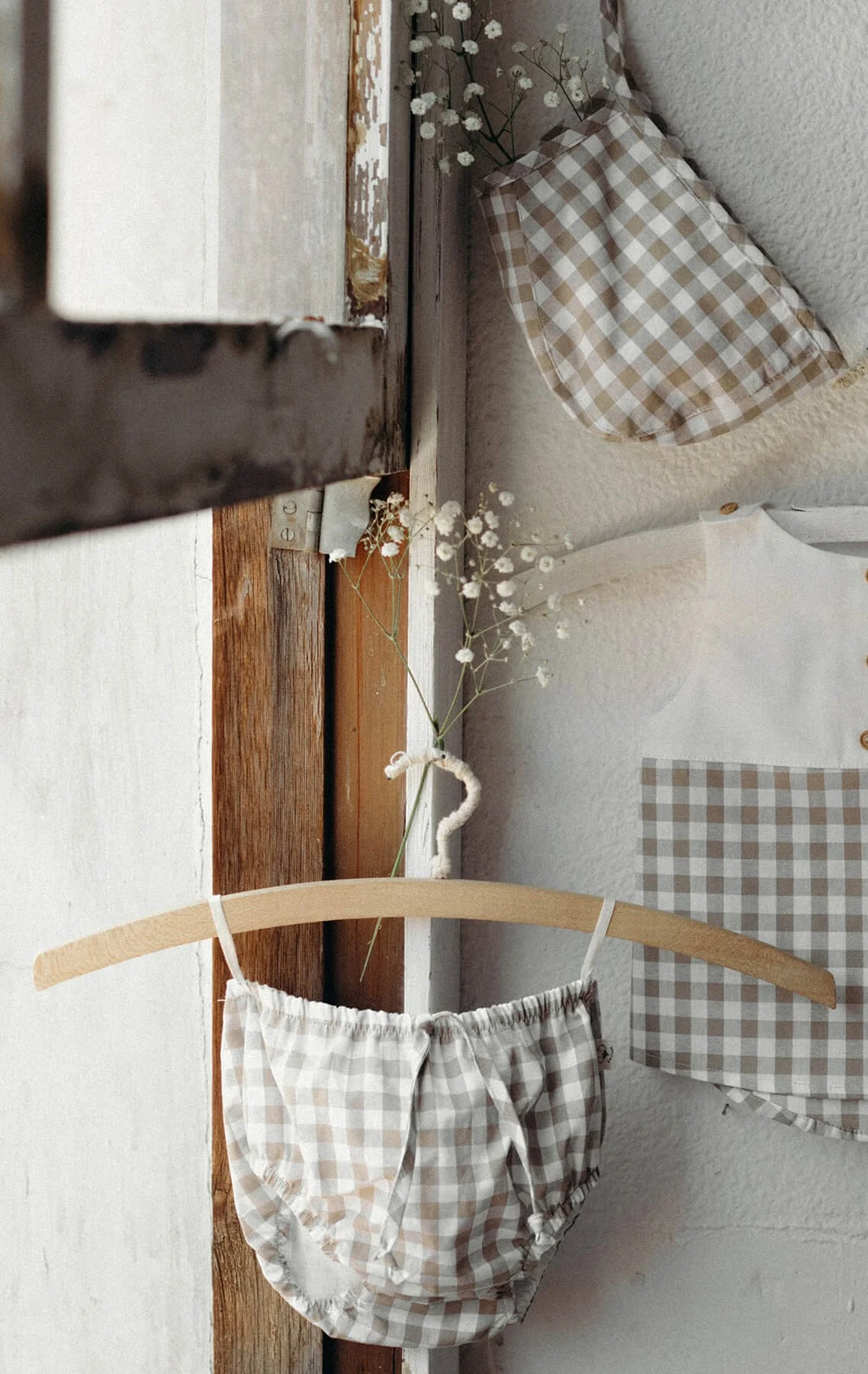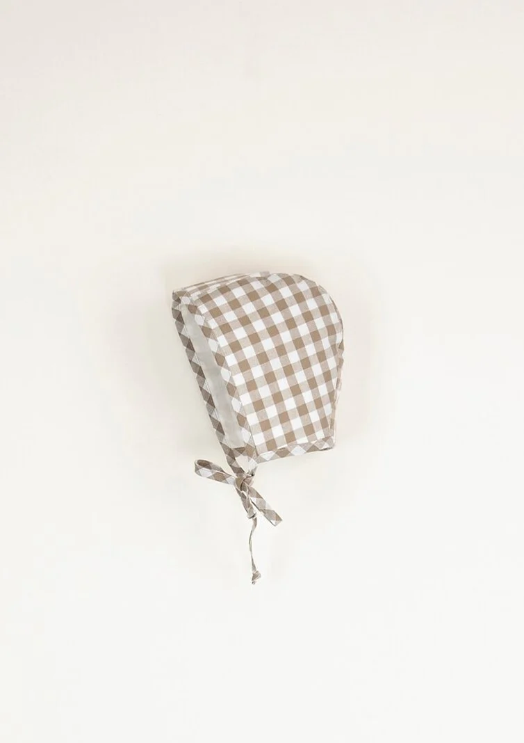 Joli béguin en vichy beige mixte. Un intemporel pour votre bébé ou enfant qui peut s’assortir avec le Bloomer Bobbie dans le même imprimé, ou pour les plus grands avec la salopette Robin.