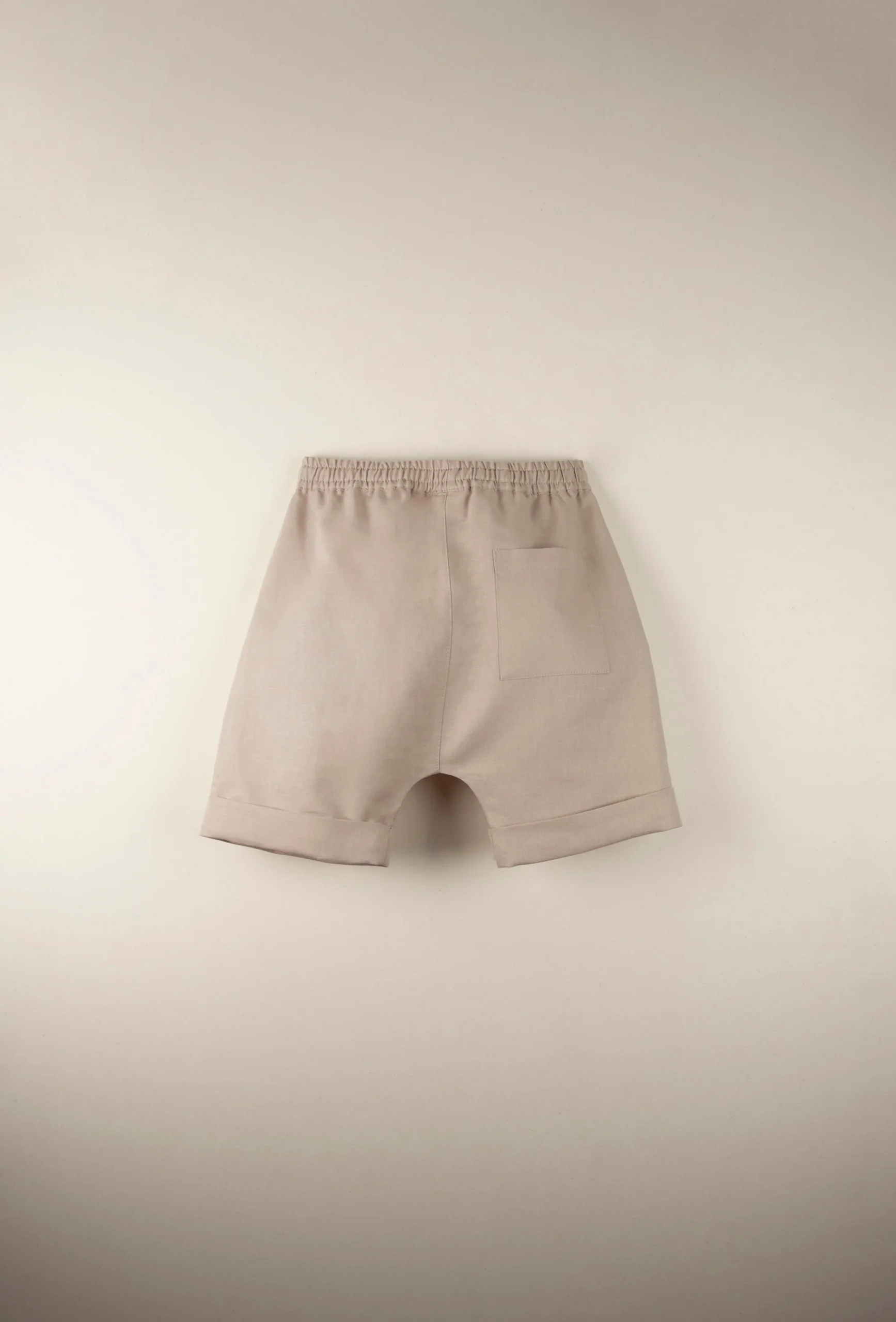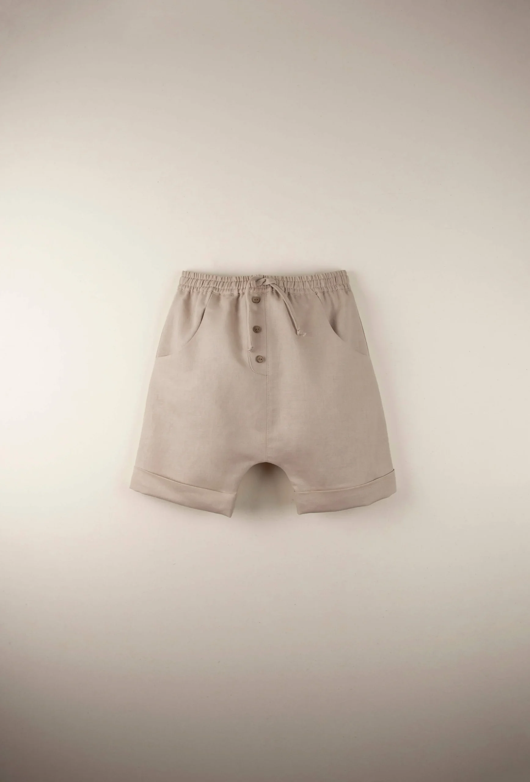 Bermuda beige au style épuré avec taille élastique et cordon de serrage. Boutons en bois sur l’avant. Bas retroussable.