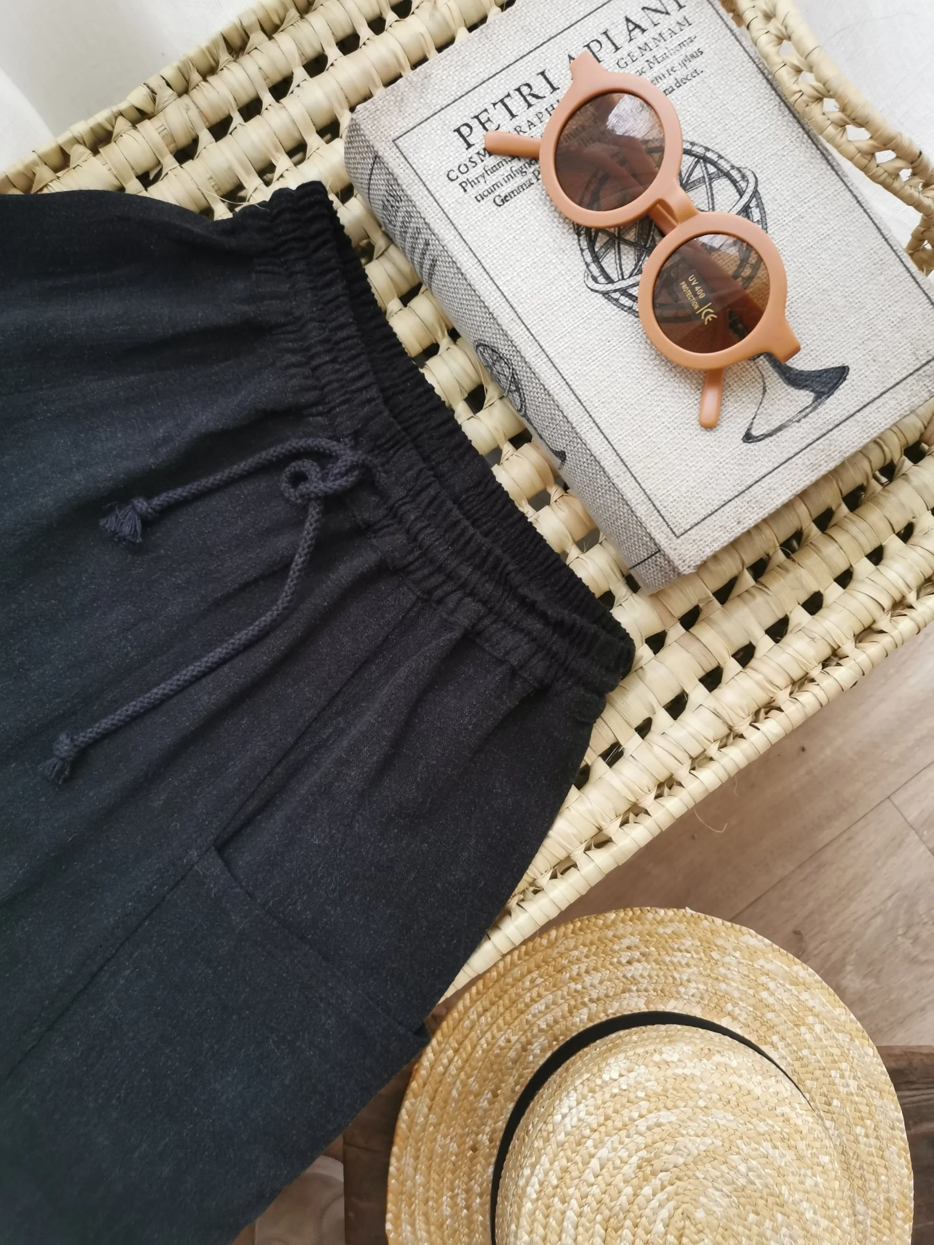 Bermuda noir taille basse avec poches latérales profondes et taille élastique avec cordon. A porter par exemple avec les chemises Pierrot.