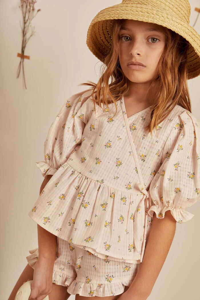 En coton biologique, la blouse cache-cœur Suzanne est dotée d’un ourlet péplum et de manches courtes bouffantes à volants. Elle se ferme grâce à son attache sur le côté. Elle respire l’été avec son imprimé floral aéré posé sur un fond quadrillé subtil, pour un fini frais et lumineux. Facile à porter, ce chemisier peut se porter avec tout, comme par exemple le short assorti Suzanne ou le short en maille bleu Nora.