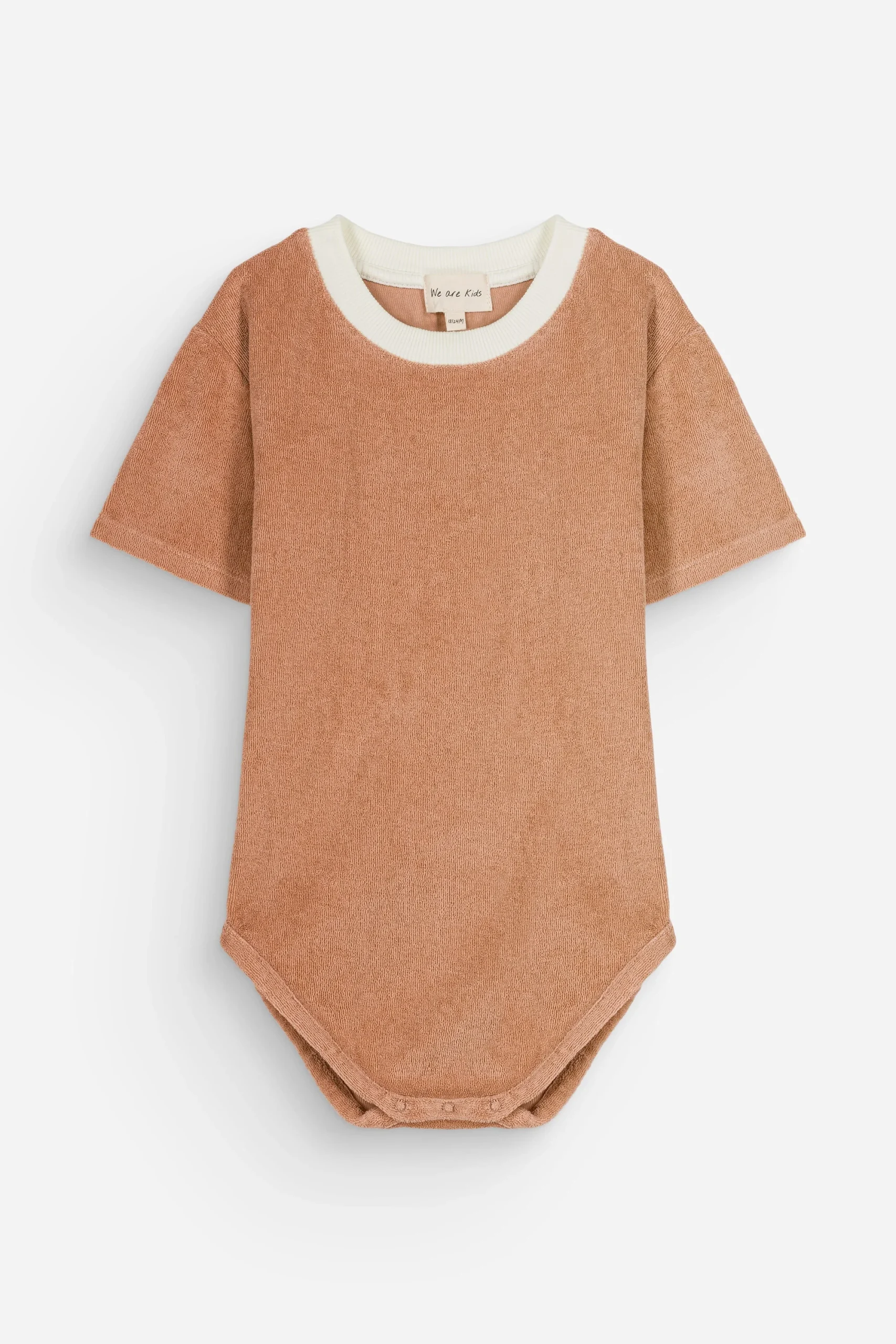 Body bébé mixte à manches courtes couleur pêche. Matière éponge toute douce et absorbante en coton bio. Col contrasté. Pressions à l’entrejambe.