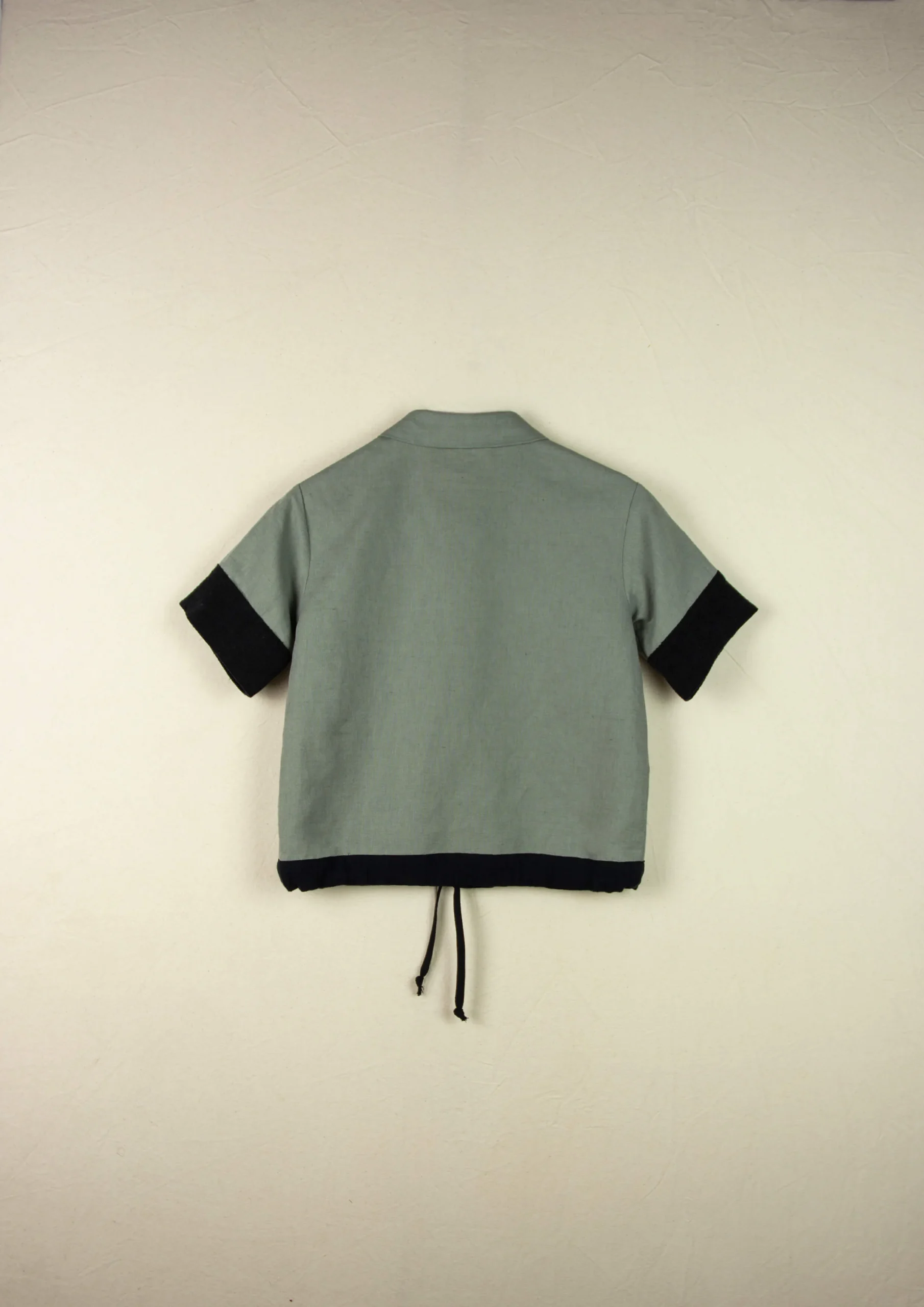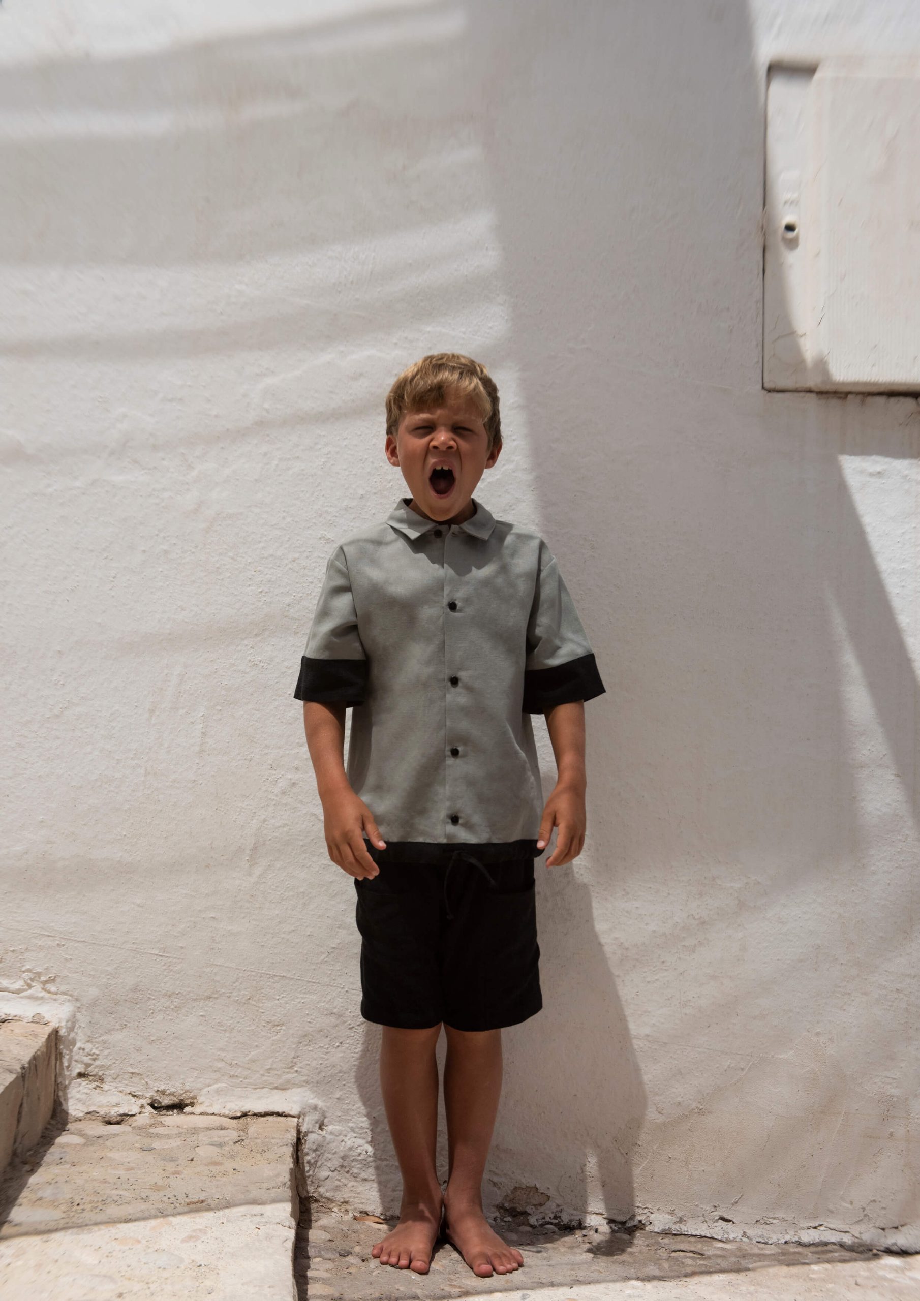 Chemise à manches courtes vert gris avec bords de manches, taille et cordon contrastés noirs. On aime son style épuré mais original ! Peut se porter pour les plus petits avec les bloomers Anton, et pour les plus grands avec les bermudas Roméo.